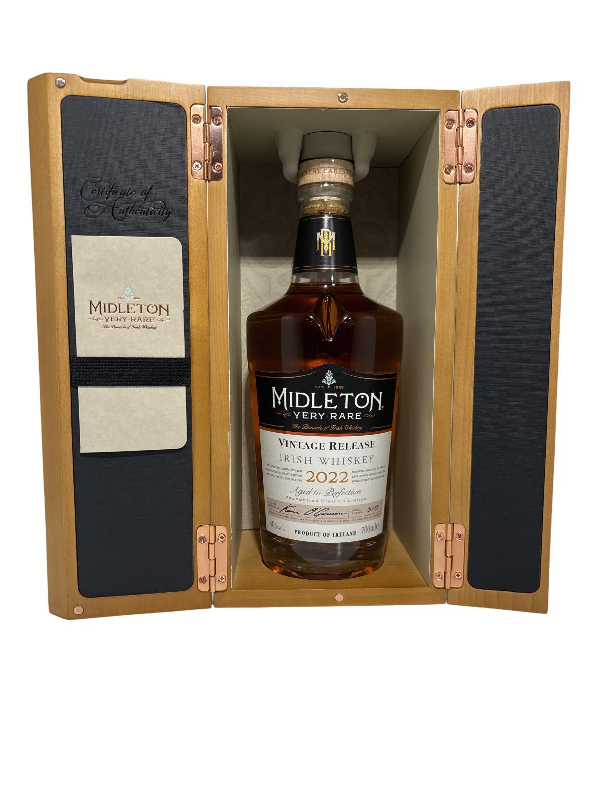 The 2022 edition to Ireland's most premium and beloved whiskey series; Midleton Very Rare. This is the 39th installment and the first release under Kevin O' Gorman appointed Master Distiller of the Midleton Distillery in 2020. Both the bottle and gift box are in very good condition, certificate and distillery invite are also included. The Midleton Very Rare range of whiskeys is a collection of highly regarded Irish whiskeys crafted at the Midleton Distillery in County Cork, Ireland. With a reputation for excellence, these whiskeys are known for their exceptional quality, craftsmanship, and limited availability. Characterized by smoothness, complexity, and depth of flavour, Midleton Very Rare often exhibits notes of ripe fruits, honey, vanilla, spices, and oak. The component casks are typically aged for around 12-27 years but each yearly batch is unique and for this reason the whiskeys are highly collectible. To this day the Midleton Very Rare series is still regarded as the pinnacle and benchmark for ultra-premium blended Irish whiskeys.