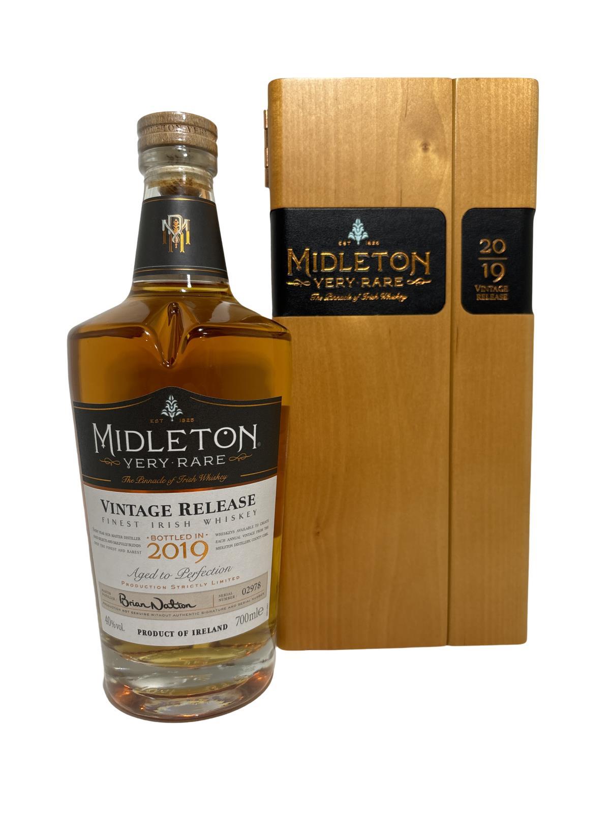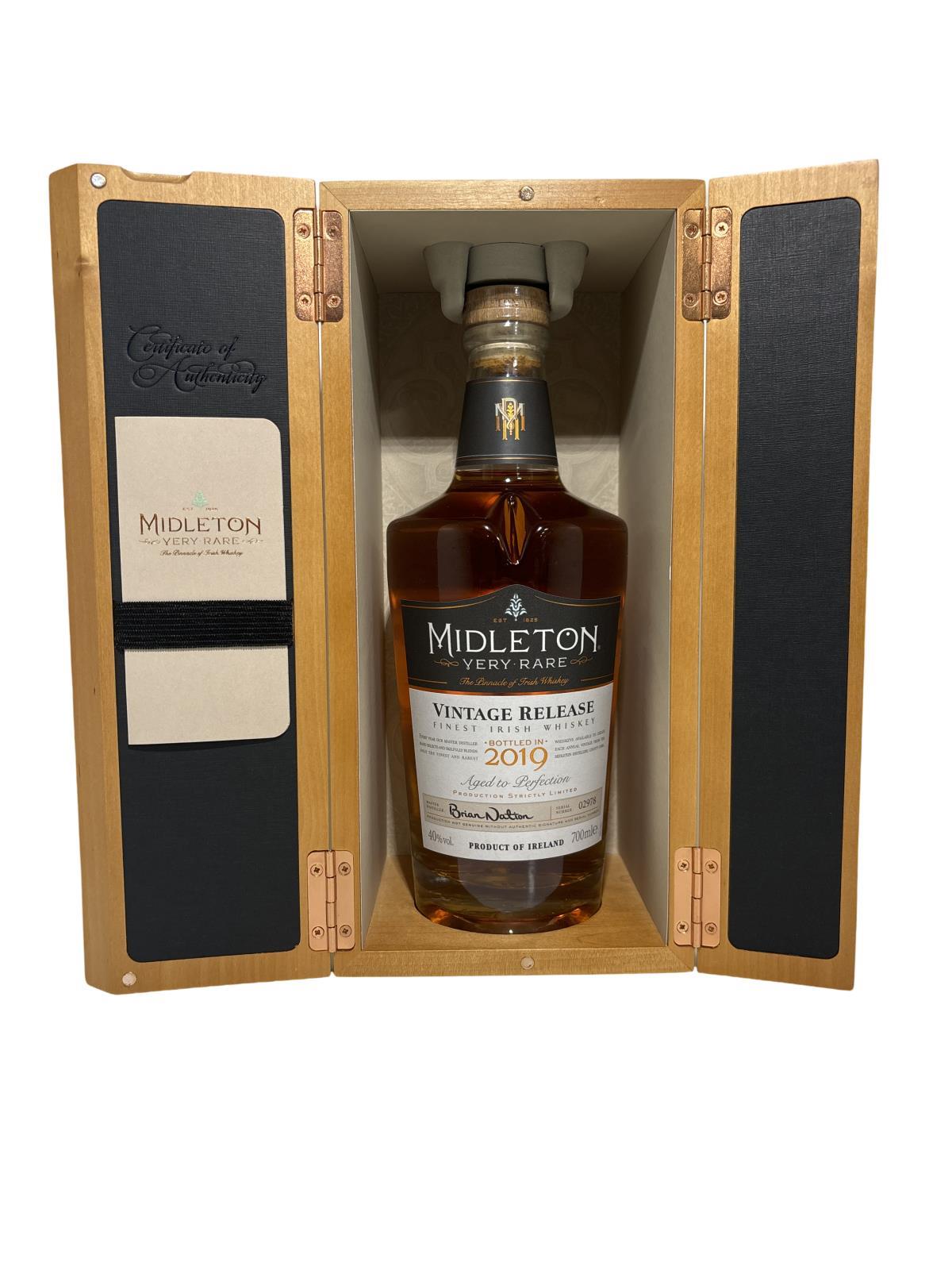 The Midleton Very Rare 2019, is a bottling brought out by the Midleton Distillery in Co. Cork. The ‘Midleton Very Rare’ range was launched in 1984 and a new vintage has been released every year since then. Barry Crockett started off the ‘Midleton Very Rare’ range while he was the Master Distiller of Midleton Distillery, in 2013 Barry Crockett retired from his role of Master Distiller. From 2014 onwards Brian Nation has been creating the ‘Midleton Very Rare’ range, maintaining its role as standard-bearer and pinnacle of Irish Whiskey. The bottle and gift box in great condition also include the cert and distillery invite.