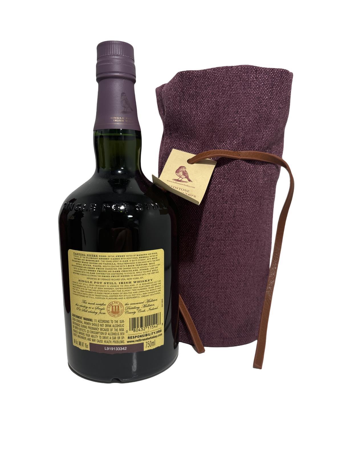 A very Limited Edition Redbreast Small Batch release hand-selected by Master Blender Billy Leighton and bottled for Julio's Liquors and Redstone Liquors in Massachusetts. Redbreast was originally created in 1912 by the legendary bottlers and distillers Gilbey’s, and the early incarnations were always sourced from the old Jameson Distillery on Bow Street in Dublin. Over the years a variety of expressions were released that were bottled at either 10 years old or 12 years old. Once the Jameson Distillery became part of Irish Distillers supplies of casks to Gilbey’s dried up and the last ‘Old Redbreast’ bottlings were released in 1985. The brand was subsequently sold to Irish Distillers and was fortunately revived in 1991 using whiskey sourced from the Midleton Distillery. All the bottlings released since then have been made using Midleton whiskey and in the main these make use of high-quality Sherry casks, with a lesser amount of Bourbon casks in each vatting. Whiskey connoisseurs have fallen back in love with Redbreast whiskey and for many it is the quintessential Irish Single Pot Still whiskey.