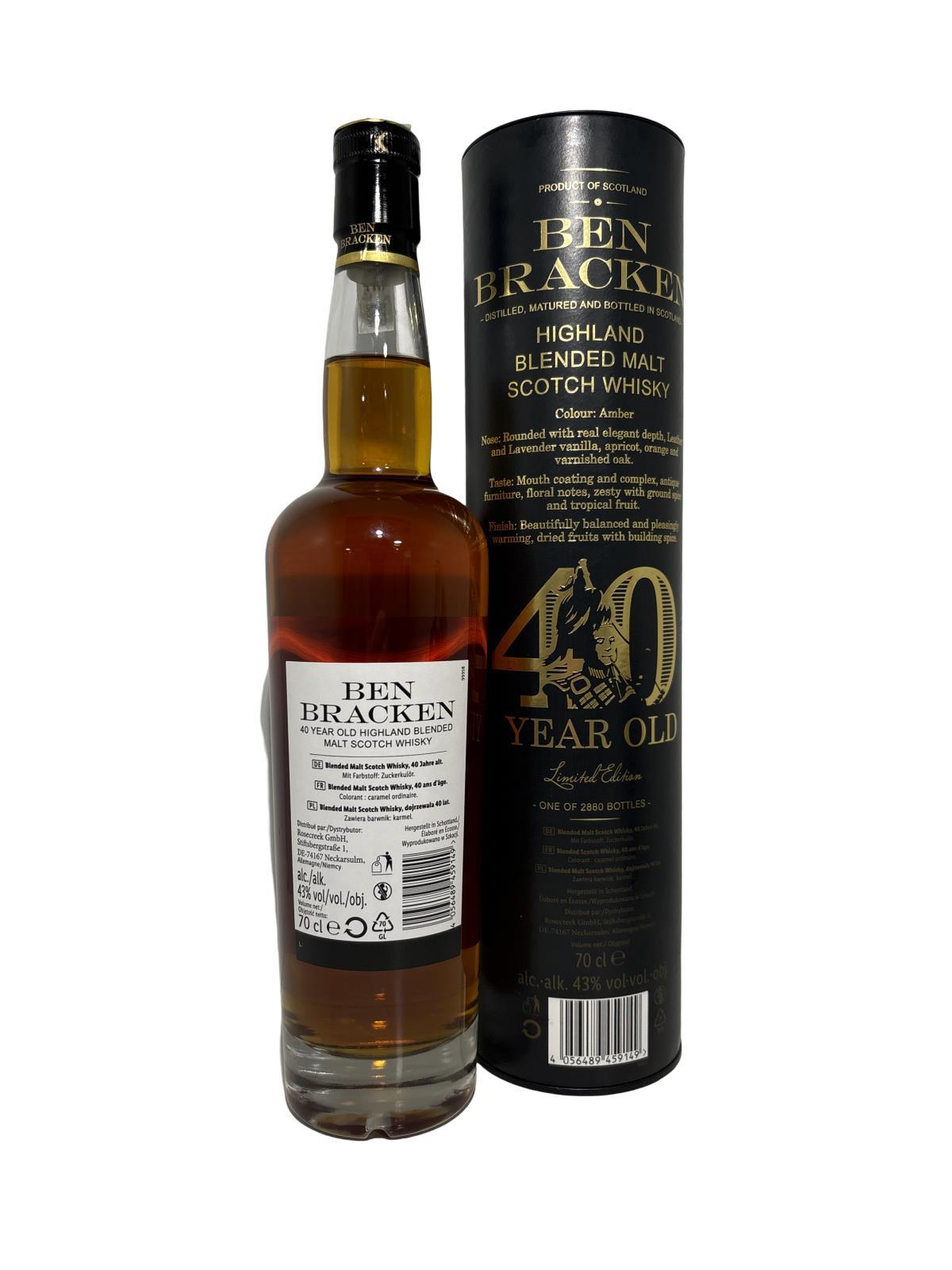 Ben Bracken 40 Years Old Highland Blended Malt is bottled by The Scottish Independent Distillers Co. Ltd. This brand is usually seen in Lidl. This chain of supermarkets shook up the whisky world some years ago with a wide range of Ben Bracken single malts up to 40 years old. This Ben Bracken 40 Years Old is a Highland Blended Malt unknown distilleries. It is a limited edition of 2880 bottles that comes in a stylish black tube.