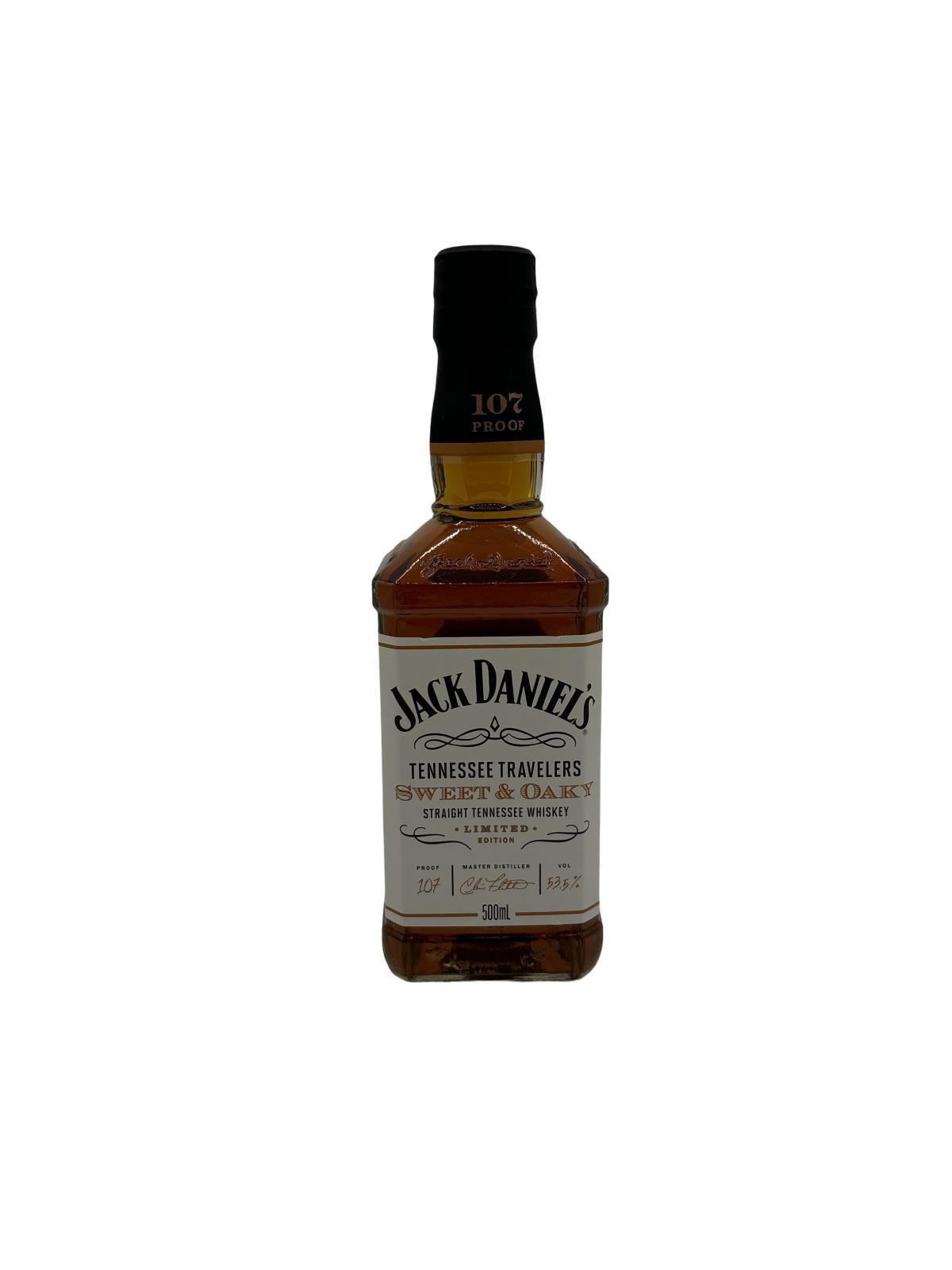 Jack Daniel's Tennessee Travelers Sweet & Oaky has a traditional 107 proof that intensifies the flavor and not the heat. The flavor is derived from the NEW American charred oak barrels. The mash is comprised of 80% Corn, 12% Barley, 8% Rye.