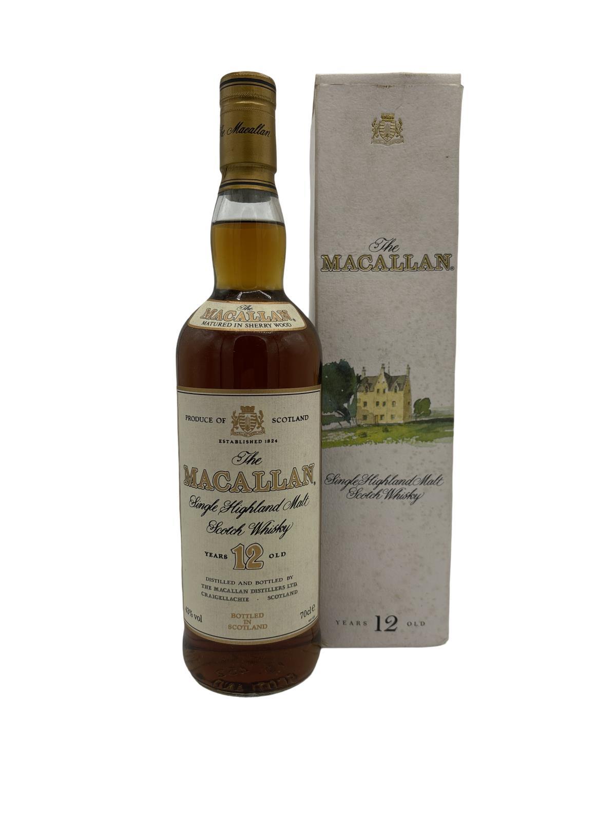 A bottle becoming increasingly rare, especially with its presentation box.The Macallan 12 Year Old. This exquisite single malt spent twelve years maturing in sherry oak from Jerez before being bottled at 43% abv. The Macallan Distillery, located in Craigellachie, Scotland, is renowned for its exceptional single malt Scotch whiskies with a strong tradition of maturation in quality Sherry casks. A rich history dating back to 1824, Macallan has established itself as a symbol of luxury and craftsmanship.