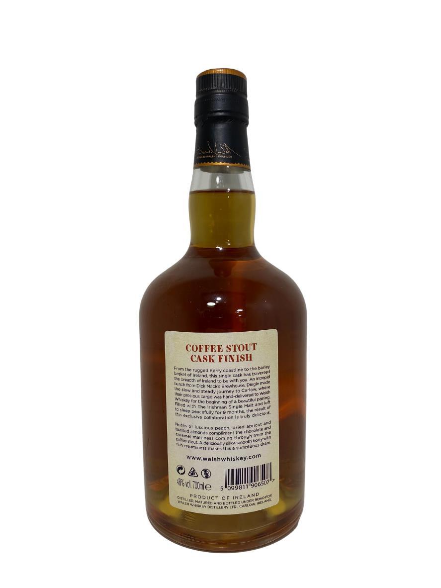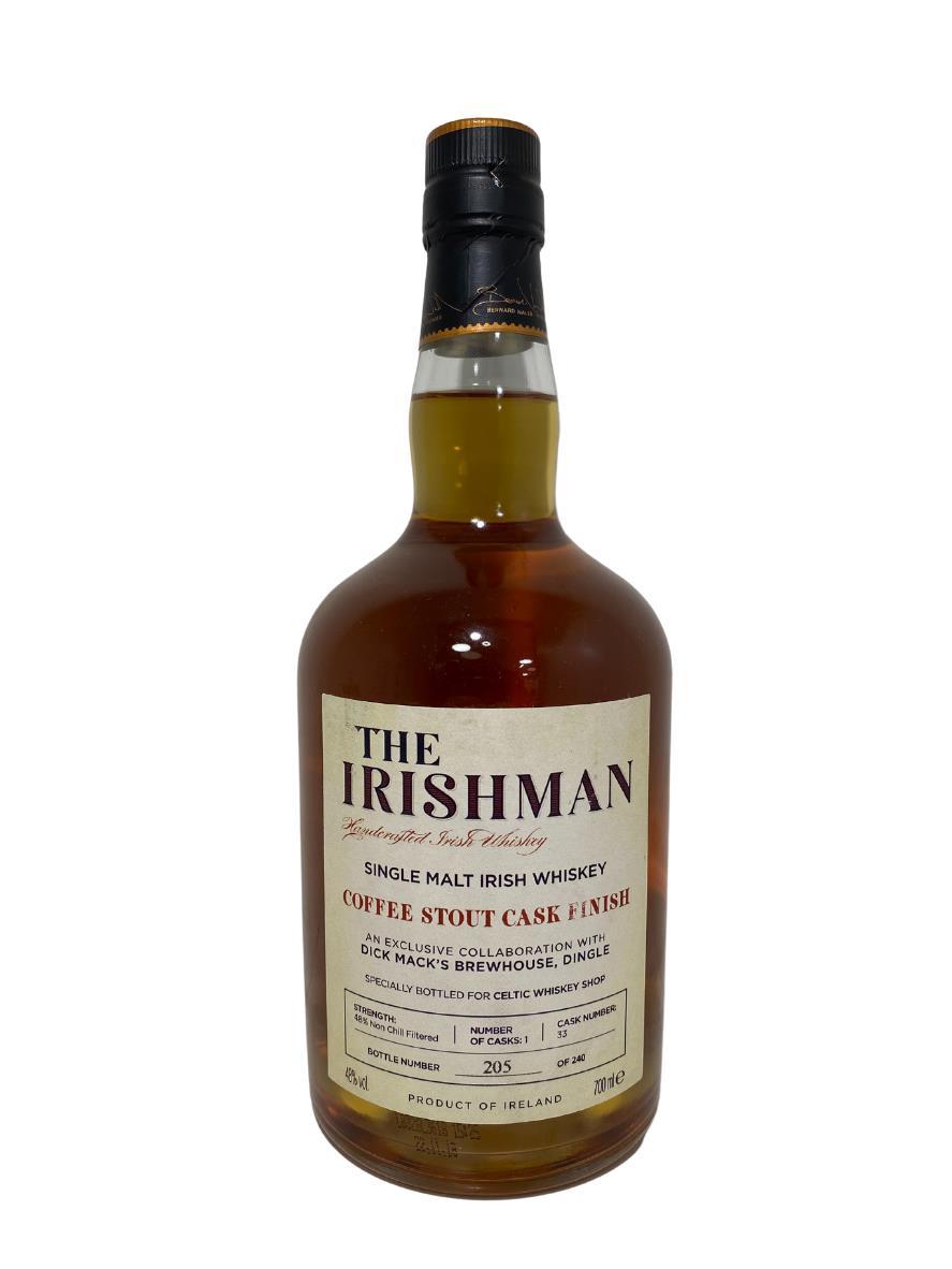 Exclusively available to Celtic Whiskey Shop, the Irishman Single Malt Coffee Stout Finish. A fantastic collaboration from Walsh Whiskey Distillery and The Dick Mack's Brewery in Dingle, Co.Kerry. The Irishman Single Malt was initially matured in both American Bourbon and Spanish Oloroso Sherry barrels before being finished for nine months in a barrel that previously held the Dick Mack's Brewery Coffee Stout.There are only 240 bottles of this limited edition