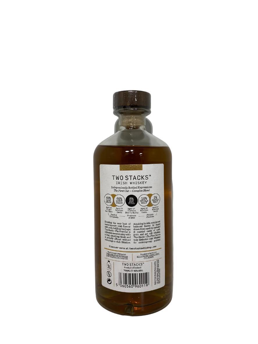 Blending the very best of contemporary Irish flavour with real distilling heritage; Two Stacks—The First Cut is delicately sweet & spicy with a long, satisfying finish and is proudly offered without colourings or chill-filtration. Acquiring its rich, complex yet balanced flavour by liquid drawn from carefully matured & married casks of malt, grain and pot still whiskey, Two Stacks—The First Cut is a truly distinctive Irish Whiskey for contemporary palettes.