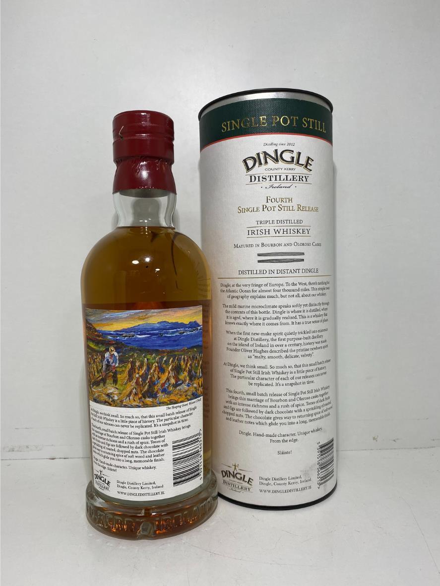 The fourth release of the small batch single pot still whiskey from Dingle Disitillery. Matured in a combination of Bourbon and Oloroso casks resulting in complex whiskey with rush of spice and deep richness. Tones of dark fruits and figs are followed by dark chocolate with a sprinkling of roasted, chopped nuts. The chocolate gives way to returning spice of soft wood and leather notes which glide you into a long, memorable finish.