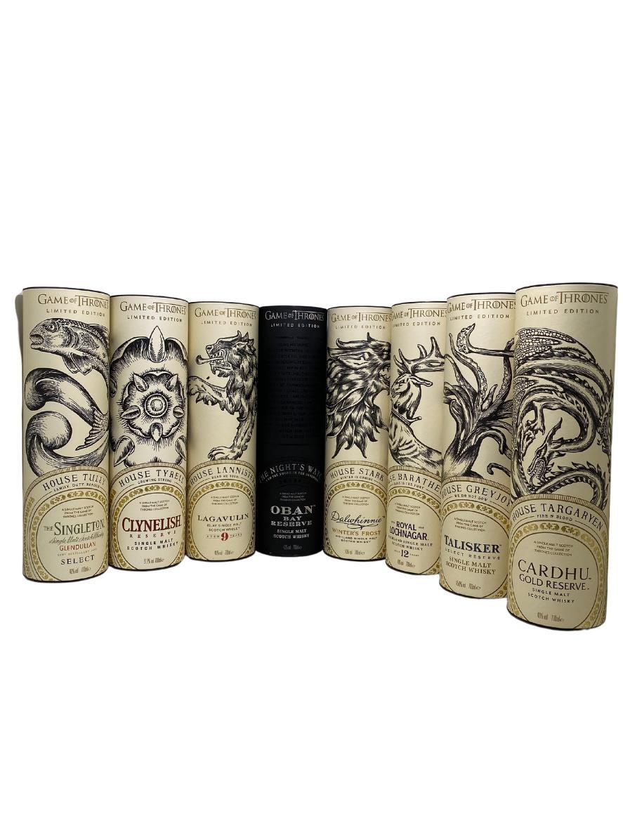 To celebrate the eighth and final season of the critically-acclaimed TV series, Game of Thrones, Diageo and HBO have released a limited-edition collection of Single Malt Scotch Whiskies. The collection features eight scotch whiskies, each paired with one of the iconic Houses of Westeros, as well as the Night's Watch, giving fans an authentic taste of the Seven Kingdoms and beyond.Included within the Game of Thrones Single Malt Scotch Whisky Collection are the following:Game of Thrones House Greyjoy 70cl - Talisker Select Reserve, Game of Thrones House Targaryen 70cl - Cardhu Gold Reserve,Game of Thrones House Lannister 70cl - Lagavulin 9 Year Old,Game of Thrones House Baratheon 70cl - Royal Lochnagar 12 Year Old,Game of Thrones House Tyrell 70cl - Clynelish Reserve,Game of Thrones House Tully 70cl - Singleton of Glendullan Select,Game of Thrones House Stark 70cl - Dalwhinnie Winter's Frost,Game of Thrones The Night's Watch 70cl - Oban Bay Reserve.