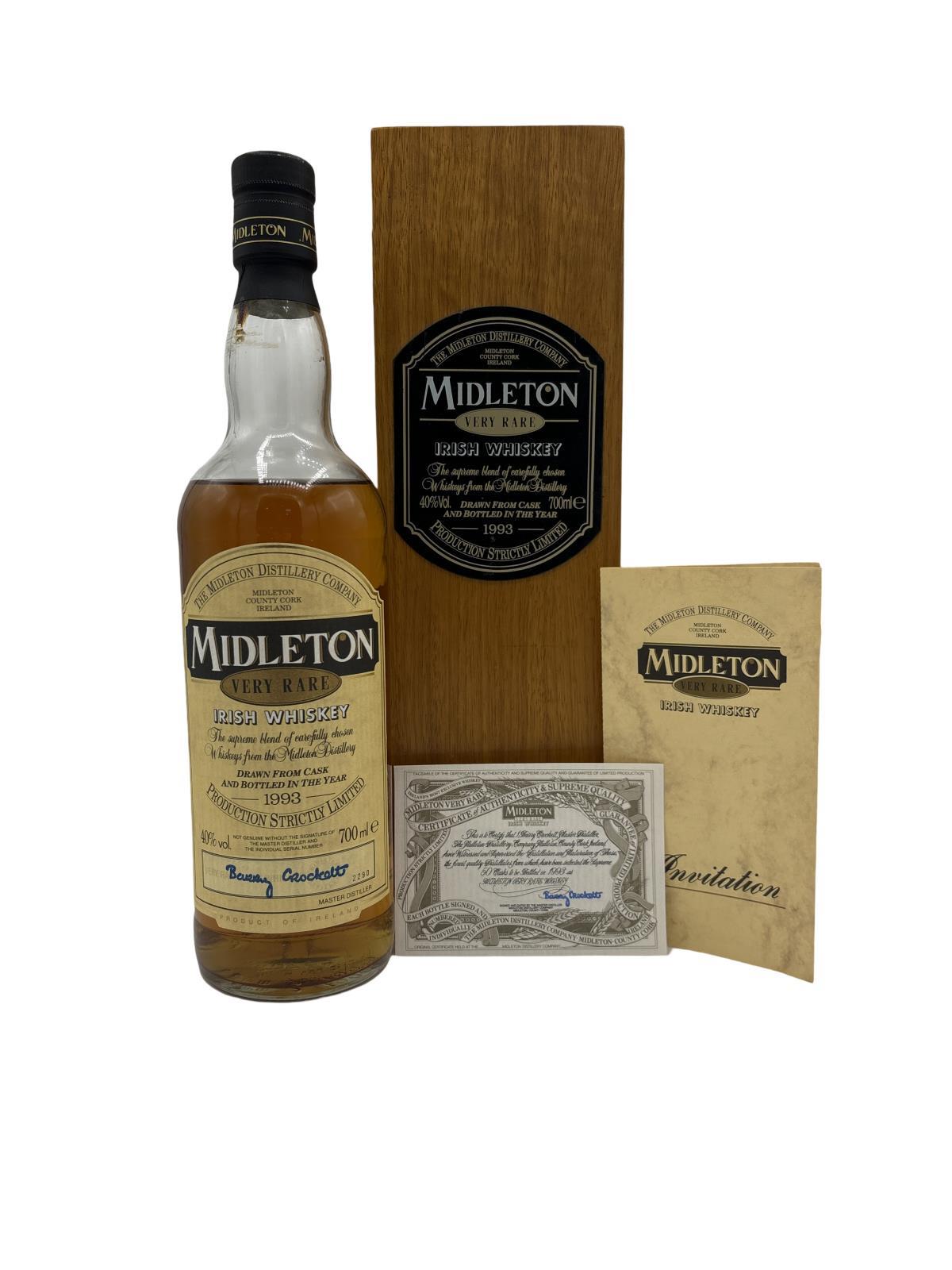 The Midleton Very Rare 1993, is a bottling brought out by the Midleton Distillery in Co. Cork. The ‘Midleton Very Rare’ range was launched in 1984 and a new vintage has been released every year since then. Barry Crockett started off the ‘Midleton Very Rare’ range while he was the Master Distiller of Midleton Distillery, The bottle and box are in great condition.  The Midleton Very Rare range of whiskeys is a collection of highly regarded Irish whiskeys crafted at the Midleton Distillery in County Cork, Ireland. With a reputation for excellence, these whiskeys are known for their exceptional quality, craftsmanship, and limited availability. Characterized by smoothness, complexity, and depth of flavour, Midleton Very Rare often exhibits notes of ripe fruits, honey, vanilla, spices, and oak. The component casks are typically aged for around 12-27 years but each yearly batch is unique and for this reason the whiskeys are highly collectible. To this day the Midleton Very Rare series is still regarded as the pinnacle and benchmark for ultra-premium blended Irish whiskeys.