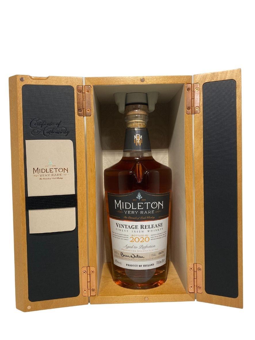 The Midleton Very Rare 2020, is a bottling brought out by the Midleton Distillery in Co. Cork. The ‘Midleton Very Rare’ range was launched in 1984 and a new vintage has been released every year since then. Barry Crockett started off the ‘Midleton Very Rare’ range while he was the Master Distiller of Midleton Distillery, in 2013 Barry Crockett retired from his role of Master Distiller. From 2014 onwards Brian Nation has been creating the ‘Midleton Very Rare’ range, maintaining its role as standard-bearer and pinnacle of Irish Whiskey. The bottle and gift box in great condition also include the cert and distillery invite. Bottle