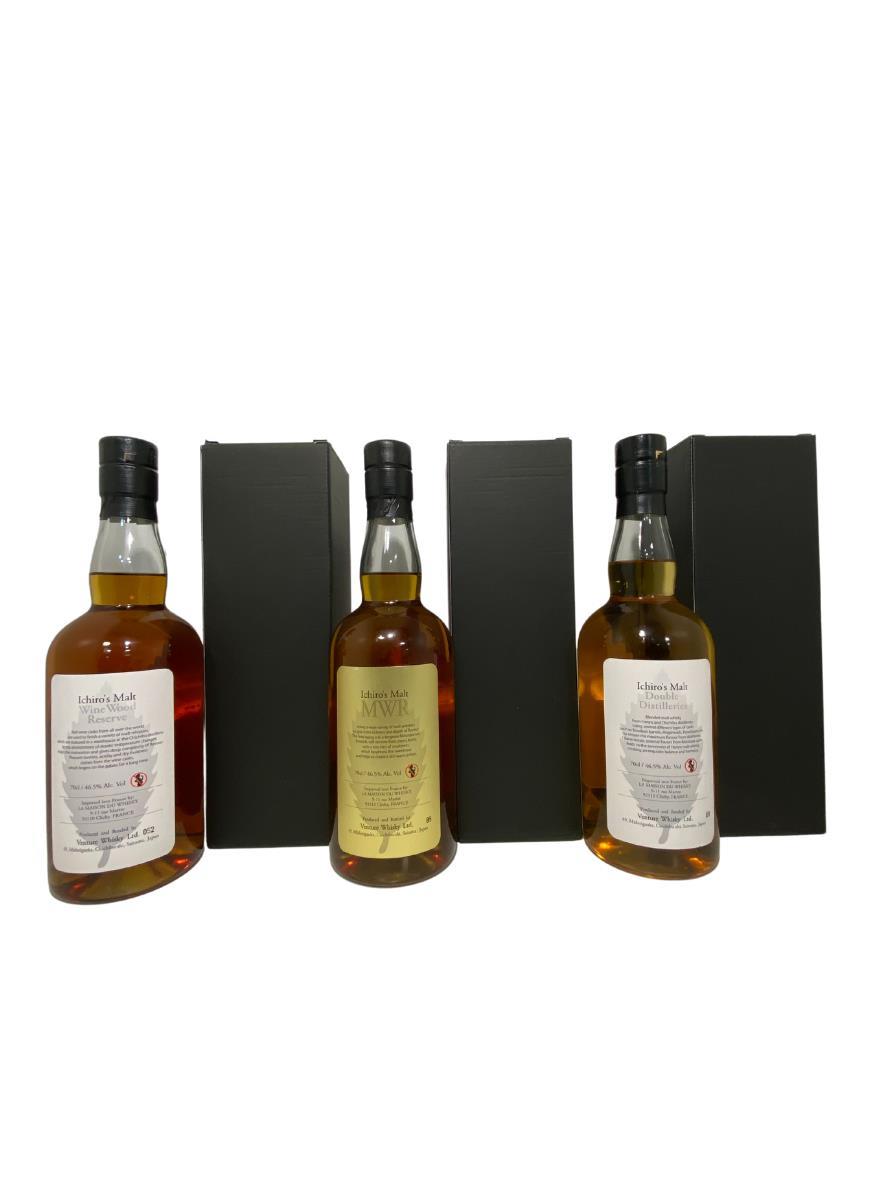 A great chance to see the different effects different wood types have on the same whiskey. This is a trio of Malt from Ichiro distillery. Wine wood finish, Mizunara Wood Finish and a double distilleries blend.