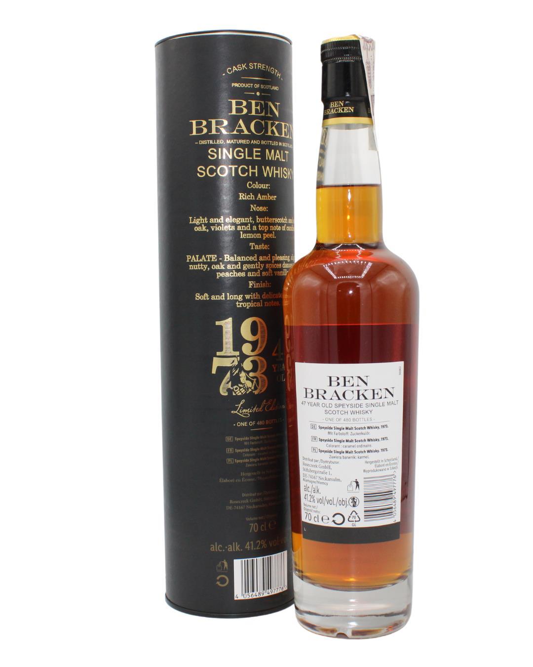 One of 480 Bottles. Lidl surprises with this 47-year-old Speyside Single Malt. The limited edition Ben Bracken 1973, bottled by The Scottish Independent Distillers, offers rich aromas of butterscotch, oak, violet, and candied lemon peel.