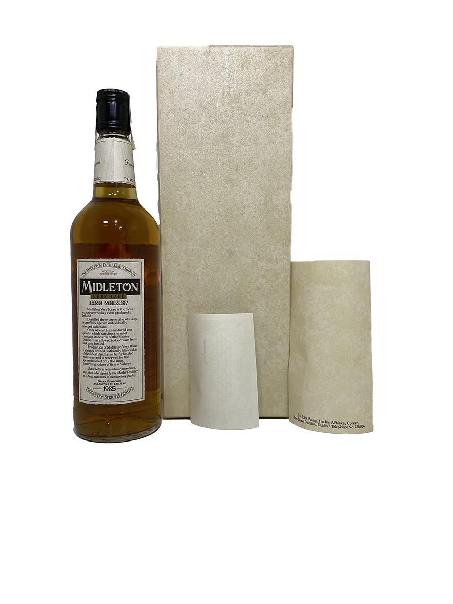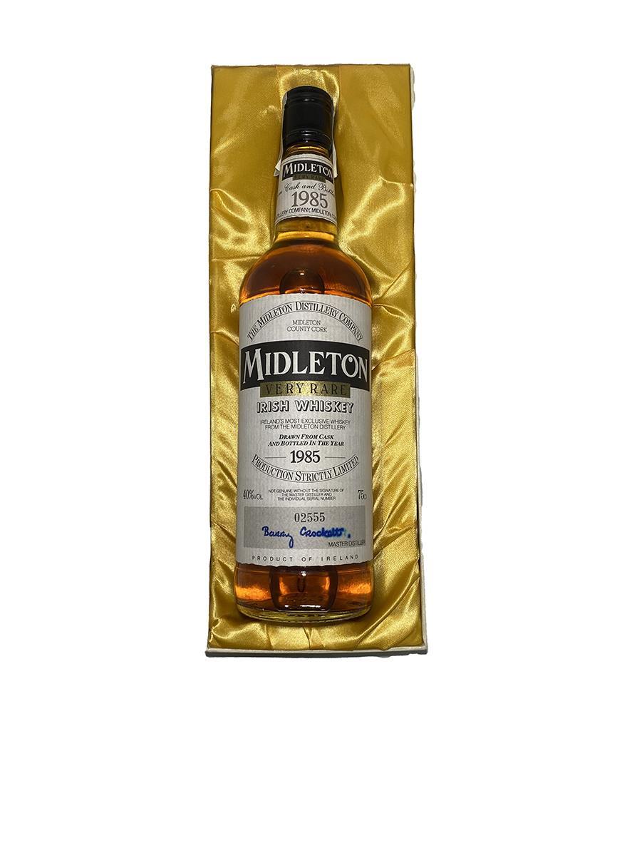 A rare and collectable bottle of Midleton Rare from the 1985 vintage when the master distiller was Barry Crockett. The Midleton Very Rare 1985 is the second edition of the Very Rare Series that began in 1984 whereby a new vintage is released every year. The bottle and box are in very good condition apart from marks and smudges visible in the pictures. Bottle number 2555