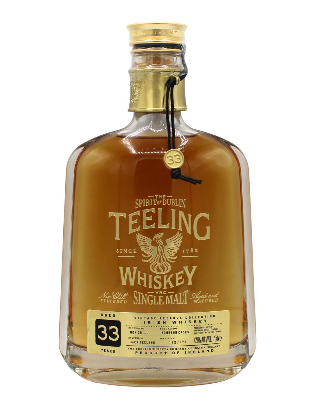 Teeling 33 Year Old is one of the oldest Irish Single Malts ever bottled, an ultra-rare release distilled in 1983 and matured for 33 years in two ex-bourbon barrels. Just 275 bottles were produced at a natural cask strength of 42.9%. Box not included.