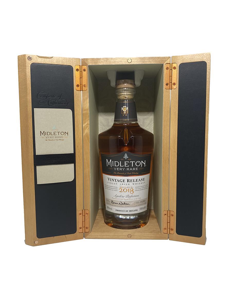 The Midleton Very Rare 2018, is a bottling brought out by the Midleton Distillery in Co. Cork. The ‘Midleton Very Rare’ range was launched in 1984 and a new vintage has been released every year since then. Barry Crockett started off the ‘Midleton Very Rare’ range while he was the Master Distiller of Midleton Distillery, in 2013 Barry Crockett retired from his role of Master Distiller. From 2014 onwards Brian Nation has been creating the ‘Midleton Very Rare’ range, maintaining its role as standard-bearer and pinnacle of Irish Whiskey. The bottle and gift box in great condition also include the cert and distillery invite. Bottle number 14283