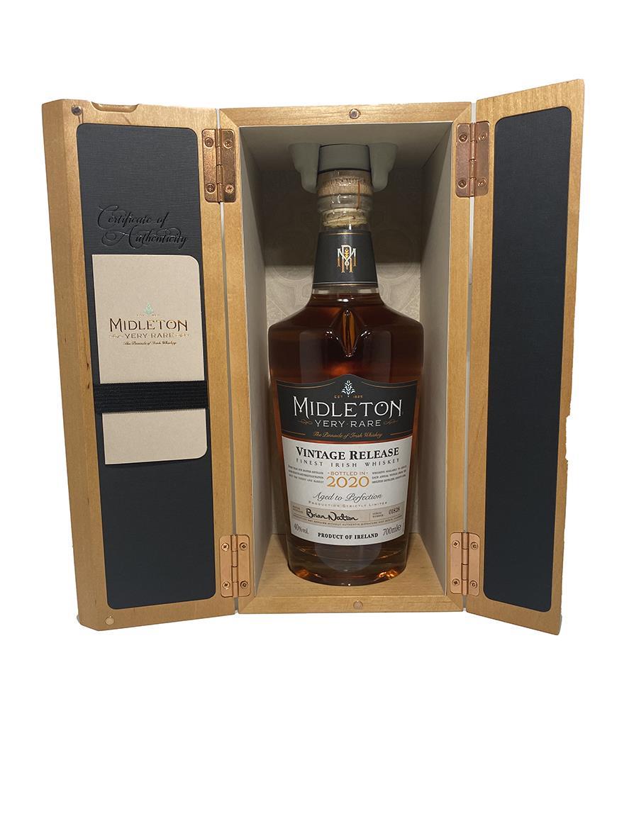 The Midleton Very Rare 2020, is a bottling brought out by the Midleton Distillery in Co. Cork. The ‘Midleton Very Rare’ range was launched in 1984 and a new vintage has been released every year since then. Barry Crockett started off the ‘Midleton Very Rare’ range while he was the Master Distiller of Midleton Distillery, in 2013 Barry Crockett retired from his role of Master Distiller. From 2014 onwards Brian Nation has been creating the ‘Midleton Very Rare’ range, maintaining its role as standard-bearer and pinnacle of Irish Whiskey.This is his last Bottling. The bottle and gift box in great condition also include the cert and distillery invite. Bottle number 1828