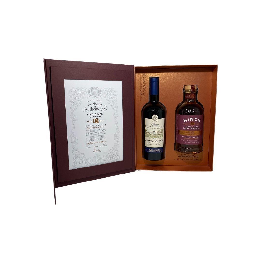 This Gift Presentation Box is a marriage of founder Terry Cross’s two great passions – Hinch Irish Whiskey distillery in County Down, Ireland, and Cháteau De La Ligne in Bordeaux, France. Casks containing the Cháteau's first ever vintage of Grande Reserve, both Cabernet Sauvignon & Merlot, were emptied and refilled with fine Irish Single Malt whiskey that has spent 18 years maturing in Kentucky bourbon barrels. The addition of a further six-month finishing period in the Grande Reserve wine casks has delivered this majestic whiskey for you to enjoy. Some Tasting notes from the whiskey bible