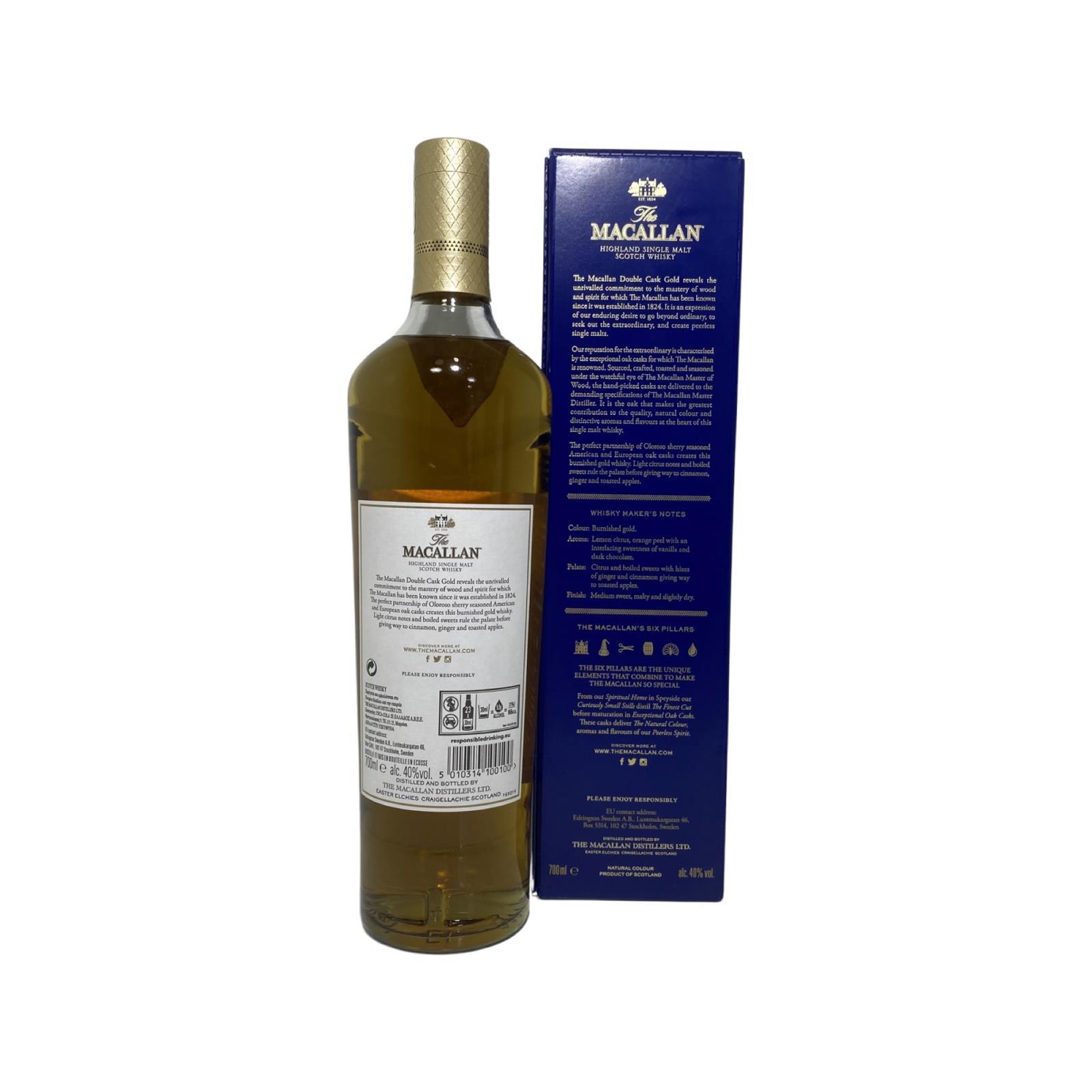 This Macallan Gold (Double Cask) forms part of Macallan's Double Cask range which is known for blending Macallan's classic style with American and European oak. This bottle was previously known as Macallan Gold (1824 series), offering the same sweet and citrusy taste with a malty finish.
