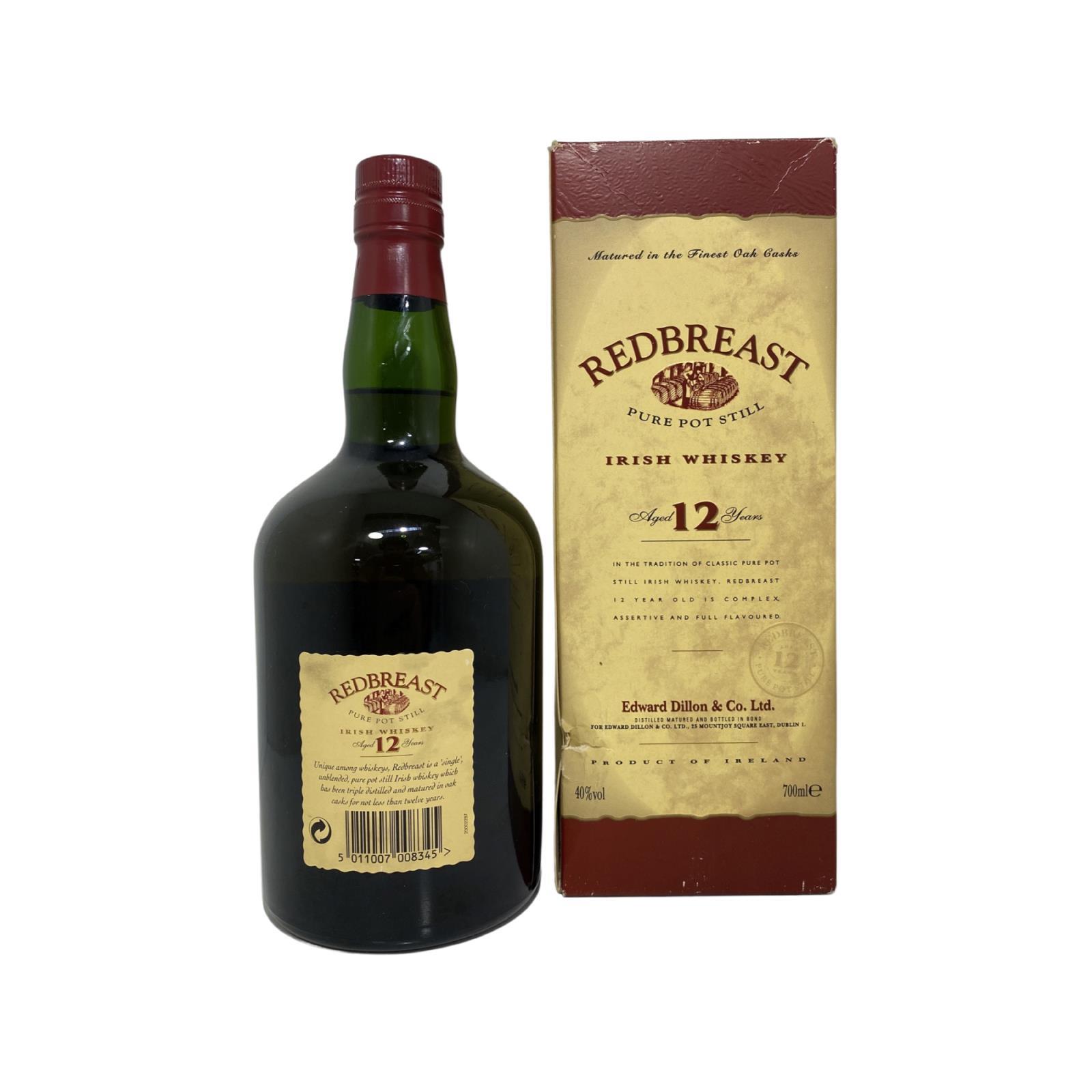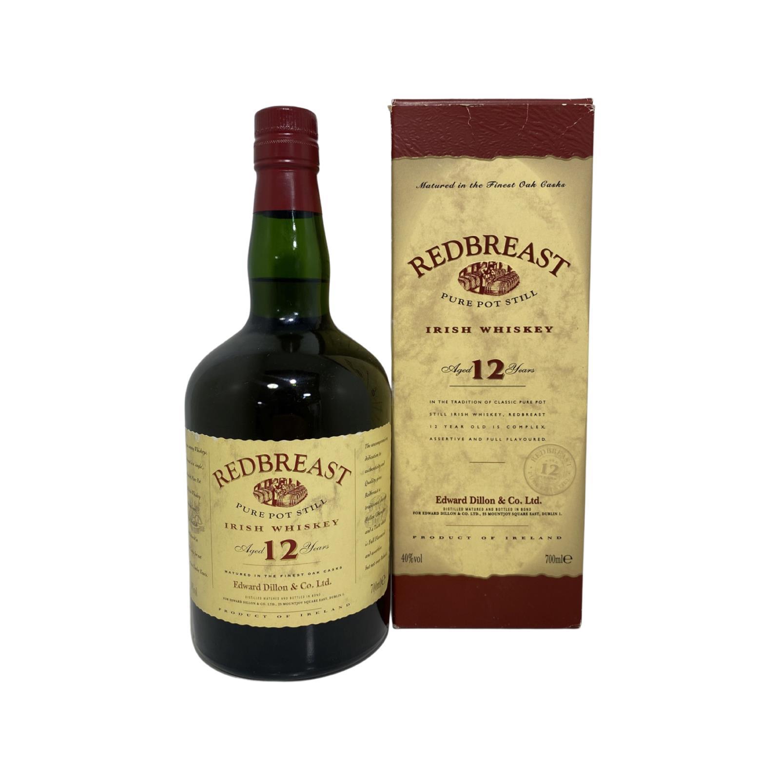 Redbreast is a single pot still whiskey, for which a combination of malted and un-malted barley are triple distilled in copper pot stills. The brand was created by W.A. Gilbey & Co, and bottled using whiskey sourced from Jameson's Bow Street distillery in Dublin. When Jameson amalgamated with Powers and Cork Distillers to form the Irish Distillers group, the Dublin distilleries were closed down, with all production moved to New Midleton distillery in Cork in 1975. Gilbey's discontinued the brand ten years later, but agreed to sell it to Irish Distillers who relaunched it in 1991.This is a 1990s example of the Irish Distillers revival of the brand, bottled for Edward Dillon & Co.