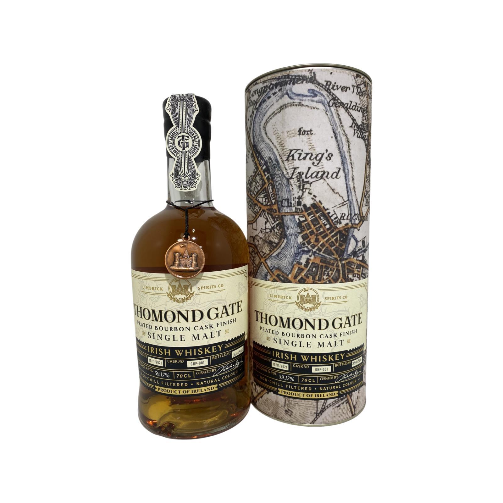 In this exclusive release, Thomond Gate has brought out a whiskey which has been on a very interesting journey. This fruity and complex whiskey was initially matured in Bourbon Casks, then finished in Pinot Noir Casks. Finally, the liquid was transferred into seven fifty-five litre quarter casks, which initially held Peated Bourbon.The Peated Bourbon 55ltrs quarter casks were crafted from the American white oak, naturally seasoned for two years in the southwest of the US and Canada, and charred to release the natural character of the wood. The cask was then filled with double distilled new make from Kings County Distillery, Brooklyn. This is from a very limited run of just 585 bottles.
