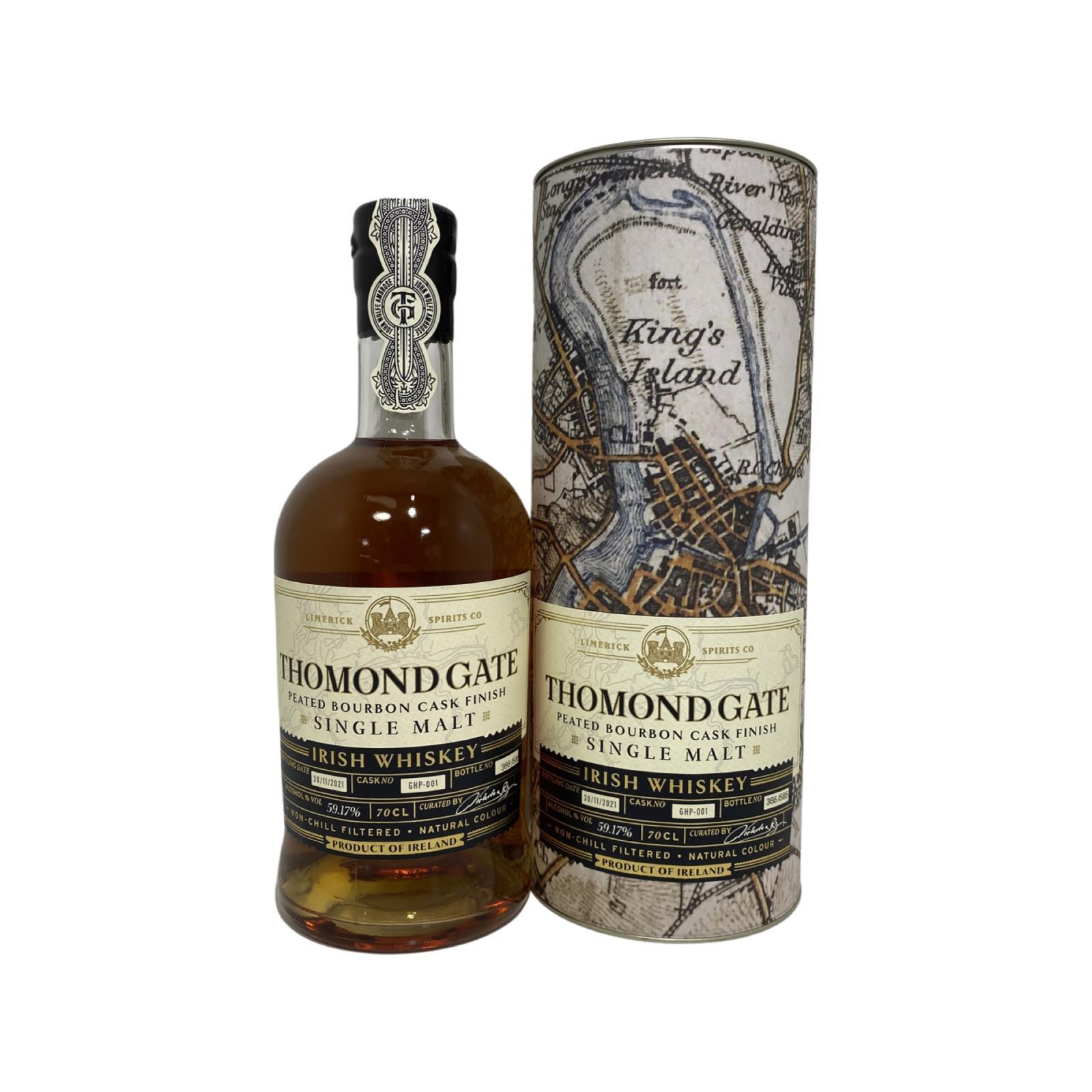 In this exclusive release, Thomond Gate has brought out a whiskey which has been on a very interesting journey. This fruity and complex whiskey was initially matured in Bourbon Casks, then finished in Pinot Noir Casks. Finally, the liquid was transferred into seven fifty-five litre quarter casks, which initially held Peated Bourbon.The Peated Bourbon 55ltrs quarter casks were crafted from the American white oak, naturally seasoned for two years in the southwest of the US and Canada, and charred to release the natural character of the wood. The cask was then filled with double distilled new make from Kings County Distillery, Brooklyn. This is from a very limited run of just 585 bottles.