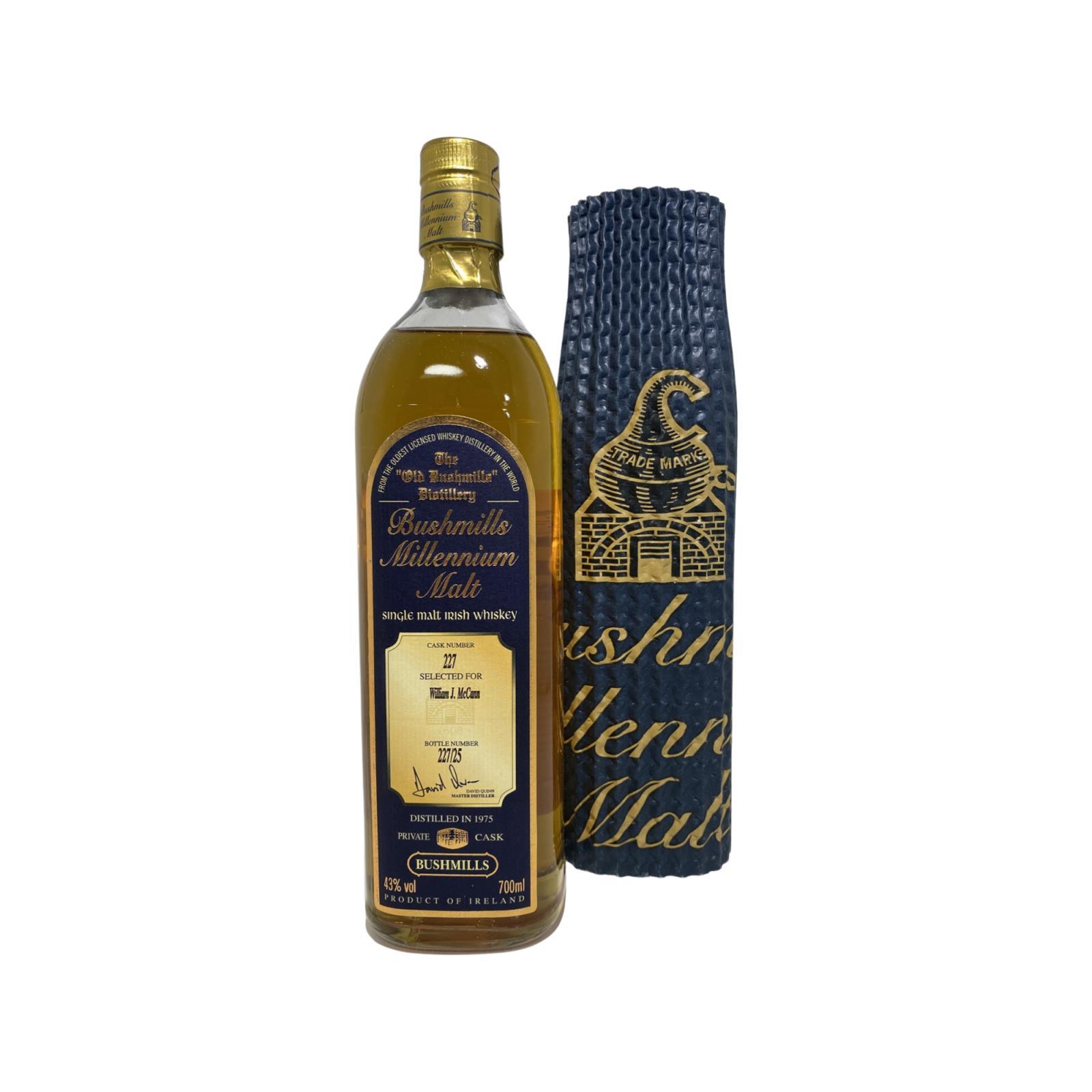Bushmills whiskey available then, with this exceptional cask being 227.Bushmills Millennium Malt is a series of single cask bottlings from whiskey distilled in 1975 and matured in ex-Bourbon barrels. This unique Bushmills Millennium Malt has come straight from the cask, pure and unfiltered, following the ancient tradition that is whiskey making in Ireland. The addition of water, which flows over the basalt rock from St. Columbs Rill, to bring it to its bottled strength, is the only change Bushmills have made to your whiskey since it began the slow gentle process of maturation in your cask, back in 1975.