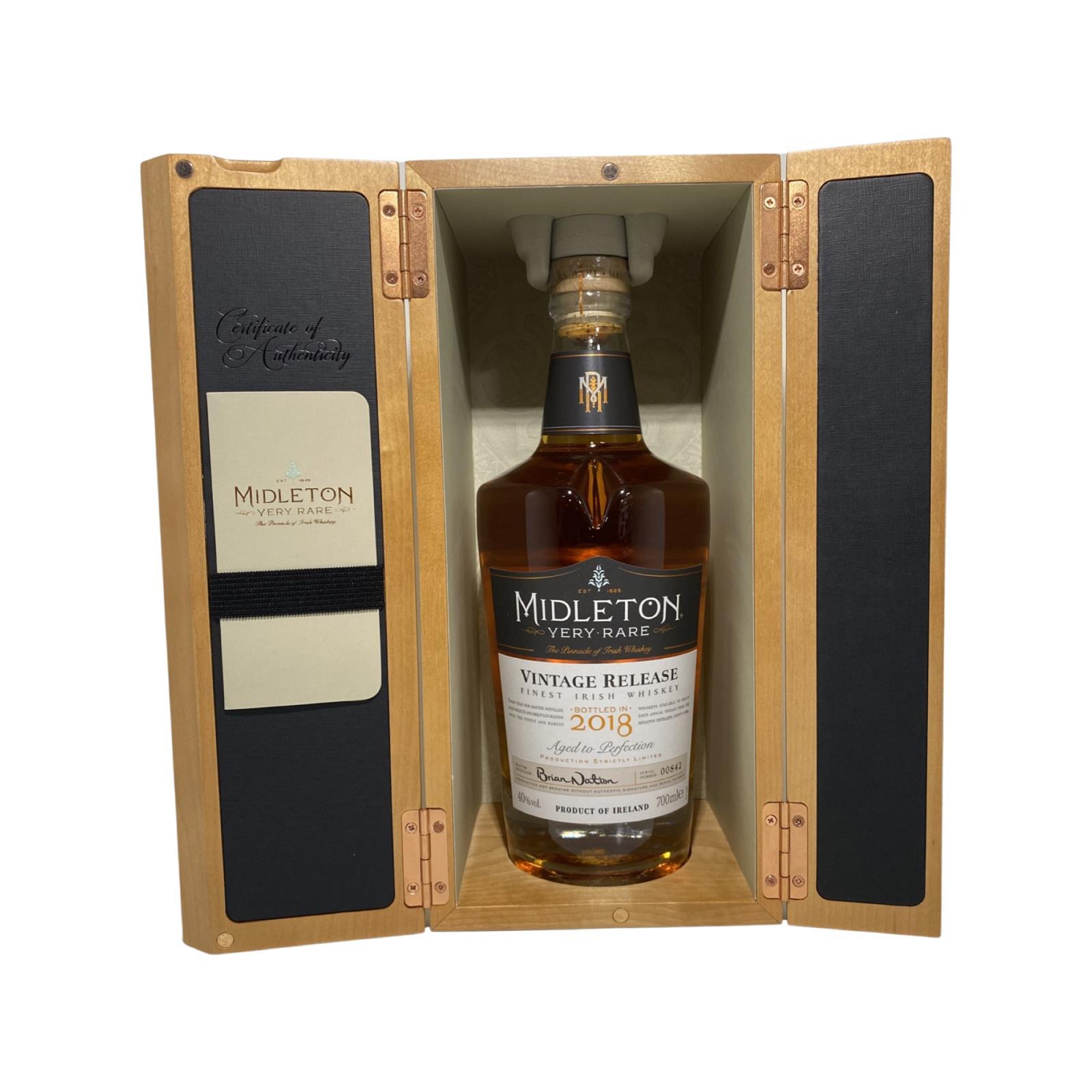 The Midleton Very Rare 2018, is a bottling brought out by the Midleton Distillery in Co. Cork. The ‘Midleton Very Rare’ range was launched in 1984 and a new vintage has been released every year since then. Barry Crockett started off the ‘Midleton Very Rare’ range while he was the Master Distiller of Midleton Distillery, in 2013 Barry Crockett retired from his role of Master Distiller. From 2014 onwards Brian Nation has been creating the ‘Midleton Very Rare’ range, maintaining its role as standard-bearer and pinnacle of Irish Whiskey. Include the cert and distillery invite. Bottle number 842