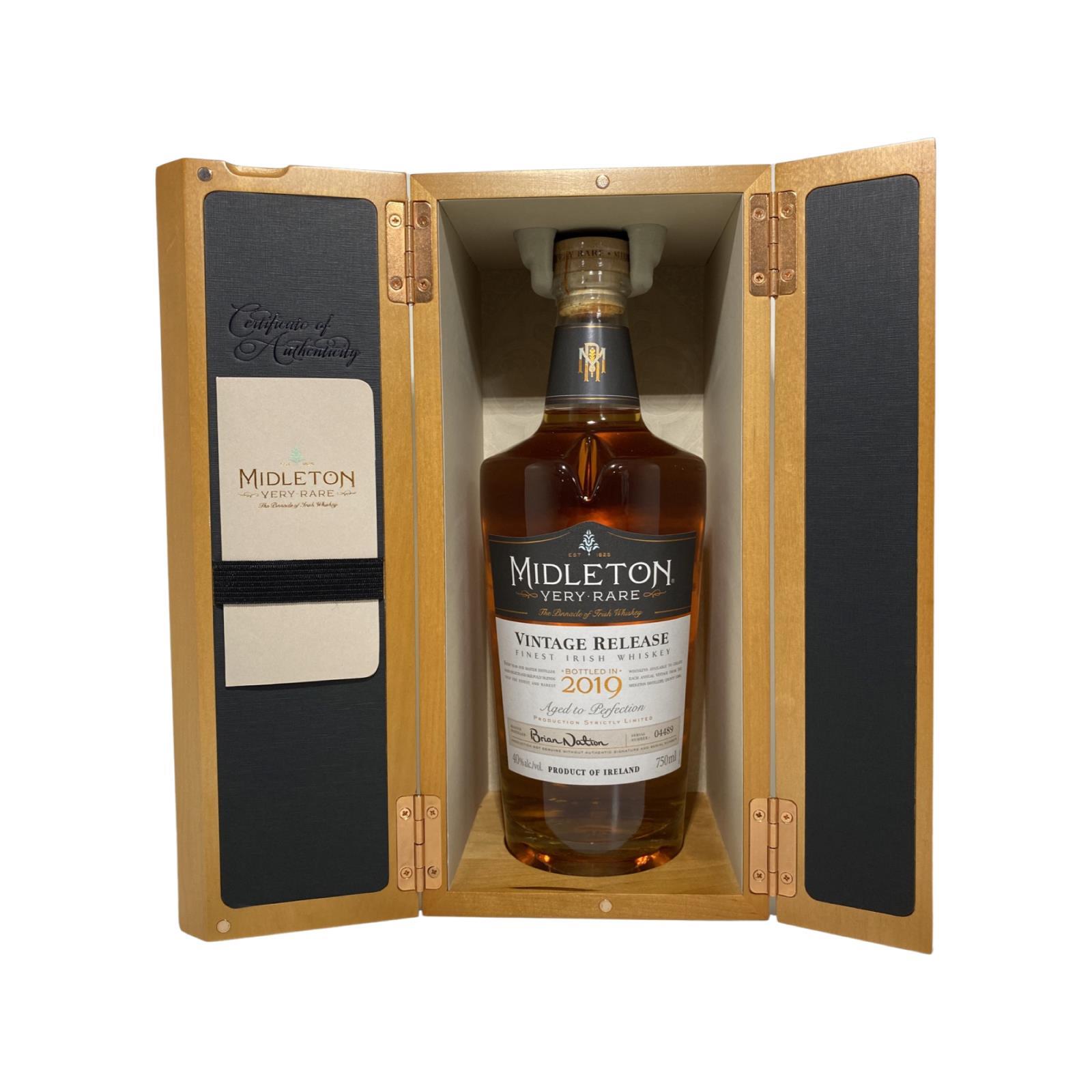 The Midleton Very Rare 2019, is a bottling brought out by the Midleton Distillery in Co. Cork. The ‘Midleton Very Rare’ range was launched in 1984 and a new vintage has been released every year since then. Barry Crockett started off the ‘Midleton Very Rare’ range while he was the Master Distiller of Midleton Distillery, in 2013 Barry Crockett retired from his role of Master Distiller. From 2014 onwards Brian Nation has been creating the ‘Midleton Very Rare’ range, maintaining its role as standard-bearer and pinnacle of Irish Whiskey. The bottle and gift box in great condition also include the cert and distillery invite. Bottle number 4489