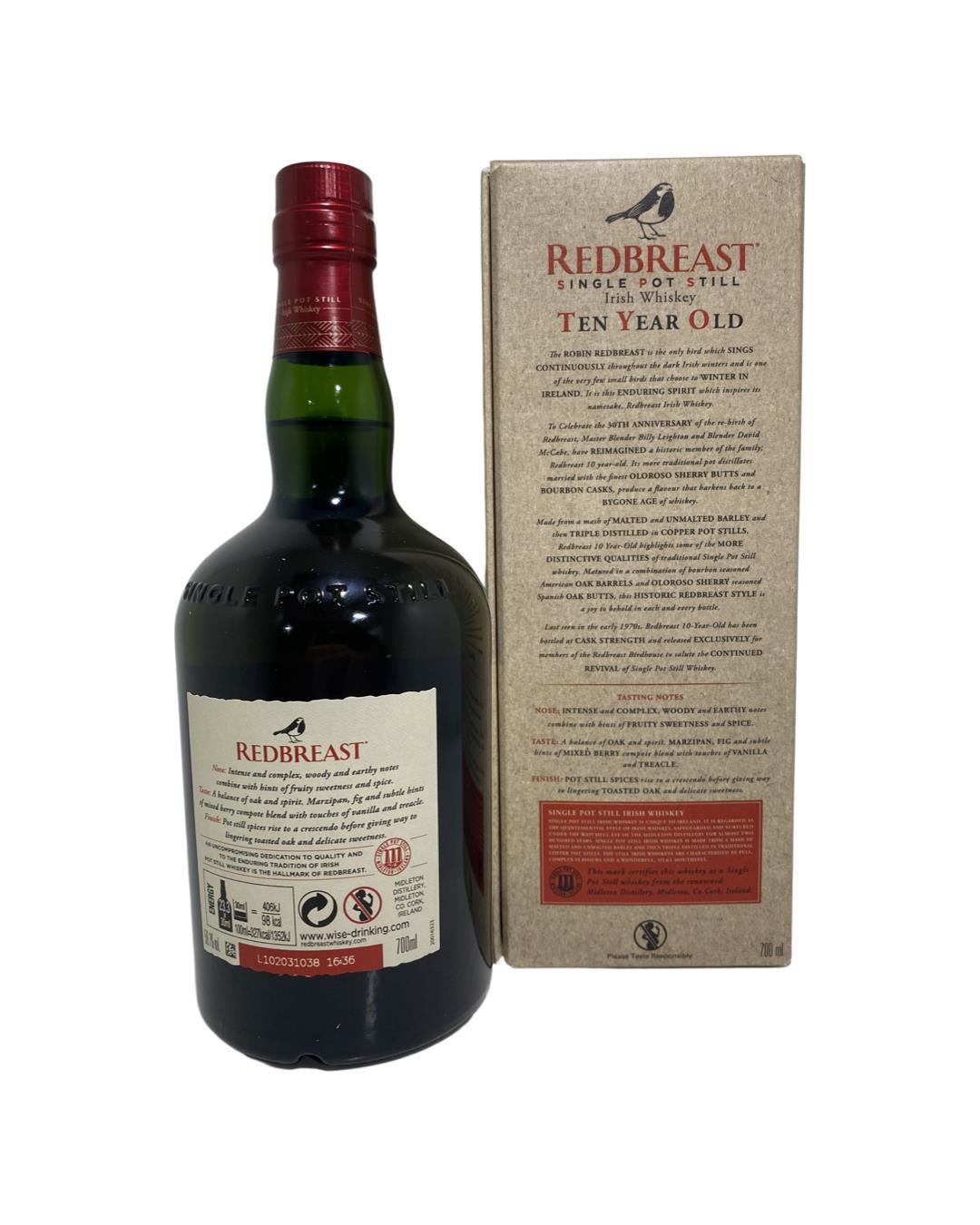 Launched to celebrate the 30th anniversary of the revival of the Redbreast brand, Redbreast 10 was resurrected. Made from a mash of malted and unmalted barley and then triple distilled in copper pot stills, Redbreast 10-Year-Old highlights some of the more distinctive qualities of traditional Single Pot Still whiskey. Matured in a combination of bourbon seasoned American oak barrels and oloroso sherry-seasoned Spanish oak butts, this historic redbreast style is a joy to behold in each and every bottle. Both the bottle and gift box are in very good condition.