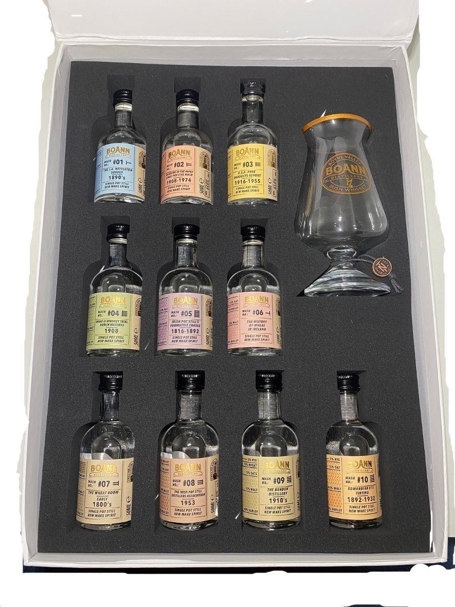 Boann Distillery is thrilled to introduce the Vintage Mashbills Tasting Pack, which is comprised of ten different single pot still new make samples, produced from the mashbills of old distilleries, now lost to the annals of time.Each Vintage Mashbill Tasting Pack contains 10 x 50ml bottles, each containing a different new make single pot still distillate. Every bottle is accompanied with a full historic background of the era in which this mashbill was in use, as well as the grains comprised in that mashbill.