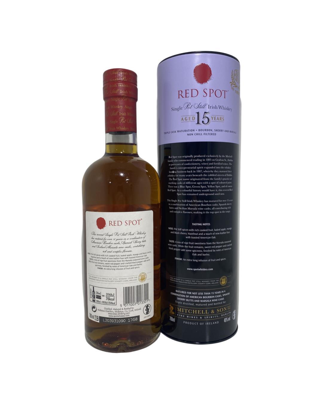 The latest addition to the Spot core range, the Red Spot 15 Year Old Single Pot Still. A whiskey that has been matured in a combination of American Bourbon casks, Sherry butts and Sicilian Marsala wine casks. Its name originates from the Mitchell family's whiskey bonding business, whereby different casks would be marked with a spot of paint, such as; Blue Spot, Green Spot, Yellow Spot & Red Spot. Until now, this whiskey had yet to be revived, however, it gives us great pleasure to welcome its return.