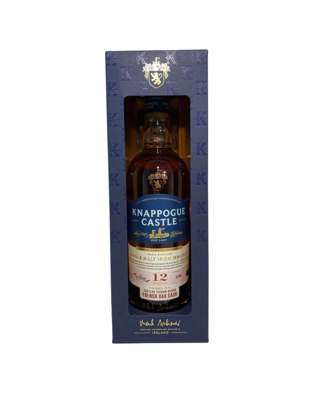 A Limited Edition Bottling from the Cask Finish series of only 2100 Bottles. Finished in a French Oak Cask from the Chateau Pichon Baron Vineyard.with the same Presentation display box as the others in the series.A 12 year old Single malt selected exclusively for Mark Andrews Knappogue castle Brand. This was a travel retail exclusive and certainly a great edition to any Knappogue collection