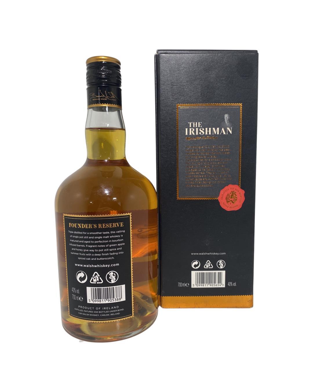 The Irishman Founder's Reserve is a limited edition, independent bottling created by Bernard Walsh. It is a high-class, luscious blend of 70% Single Malt and 30% Single Pot Still.