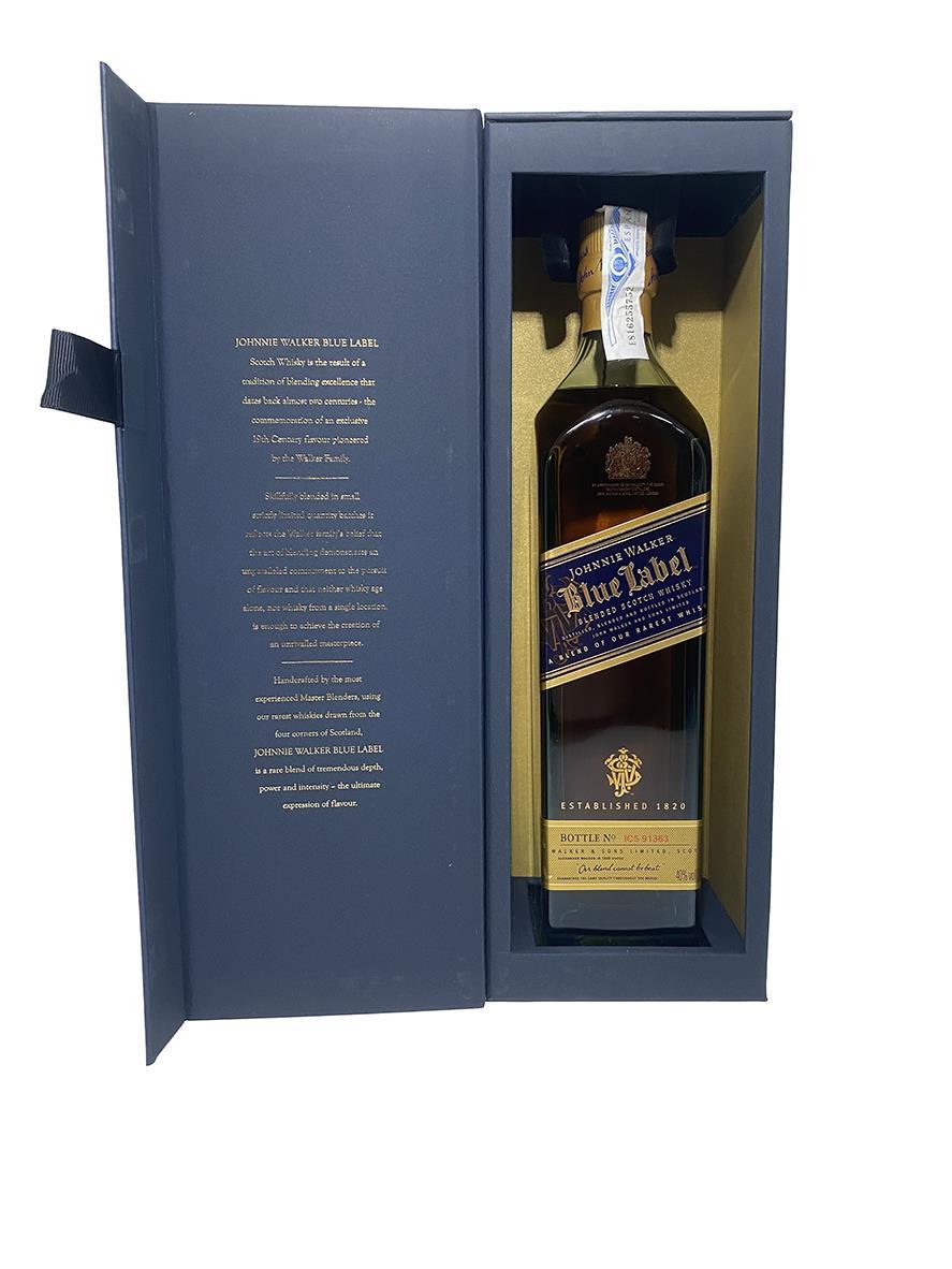 Johnnie Walker's top blend. The Blue Label is vatted from superior aged whiskeys. Johnnie Walker Blue Label sets the standard, with layers and layers of flavor from hand-selected, rare casks from across the distilling regions of Scotland. Its flavors are influenced by the smoke of the west and the rich, sweet whiskies of the east.