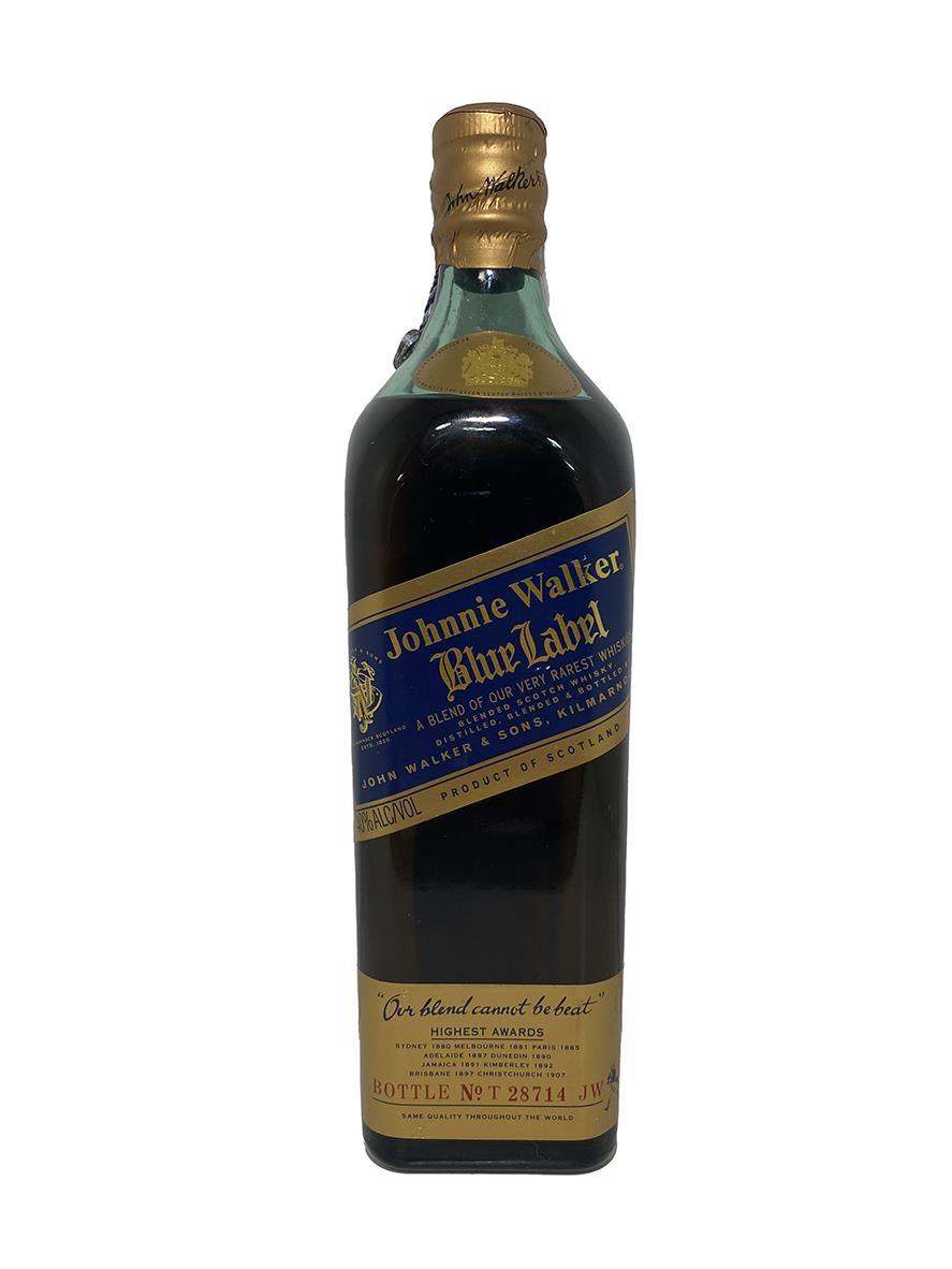 Johnnie Walker's top blend. The Blue Label is vatted from superior aged whiskeys. Johnnie Walker Blue Label sets the standard, with layers and layers of flavor from hand-selected, rare casks from across the distilling regions of Scotland. Its flavors are influenced by the smoke of the west and the rich, sweet whiskies of the east. This is the older bottling when it was still based in Kilmarnock. No box included.