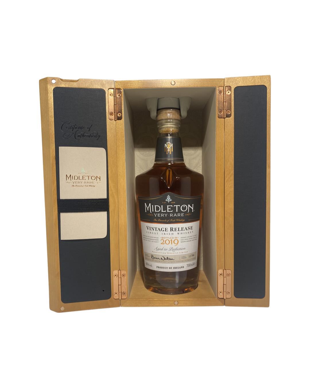 The Midleton Very Rare 2019 is part of the Midleton Very Rare collection that began in 1984 whereby a new vintage is released every year. The bottle and box are in very good condition, the certificate and distillery invite are both included. Bottle Number