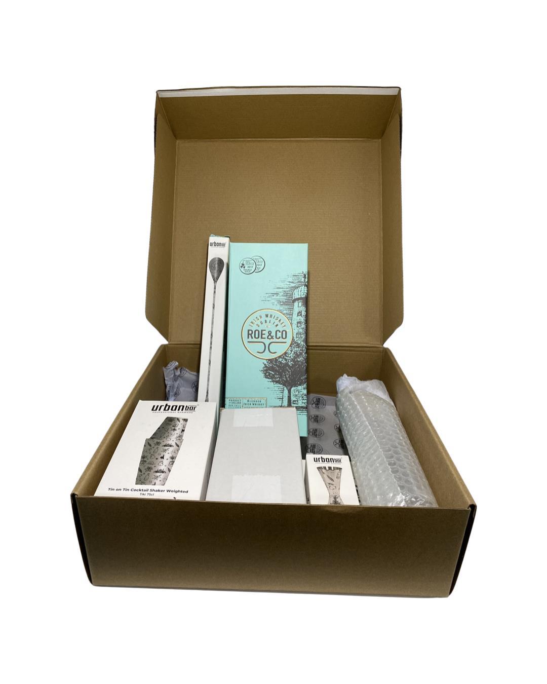 A perfect start to a home bar with all the equipment to make the perfect whiskeycocktail this set includes a bottle of Roe and Co, a coup style glass, bar spot, jigger, 2 srainers and a mixing glass.
