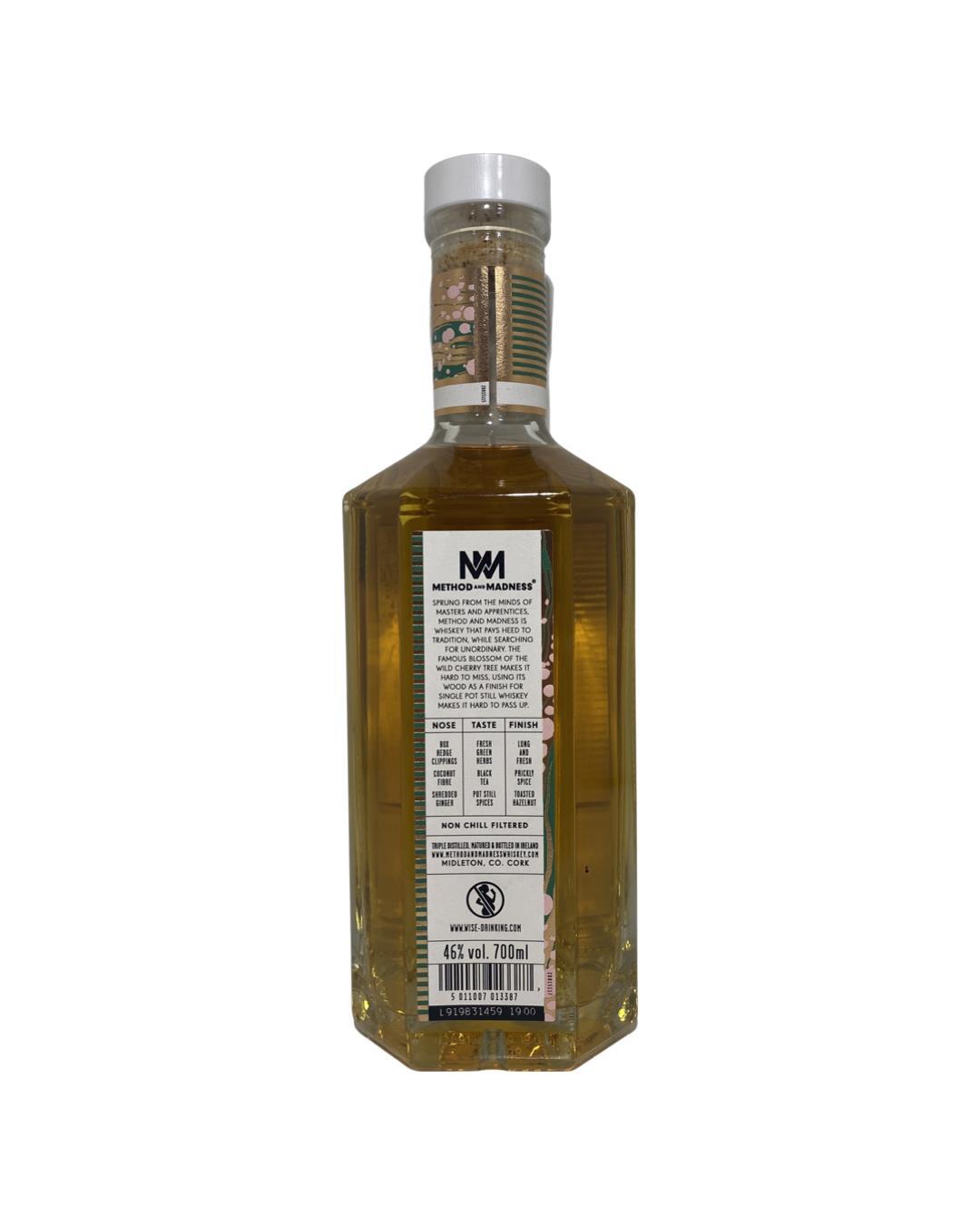 A Method and Madness Single Pot Still Irish Whiskey finished in Wild Cherry Wood. A brave and exciting new approach to whiskey maturation, it marks the first time that a single pot still Irish whiskey has been finished in nine wild cherry wood casks. A bold and fresh whiskey with plenty of complexity and spice. Bottled at 46%, non-chill filtered.