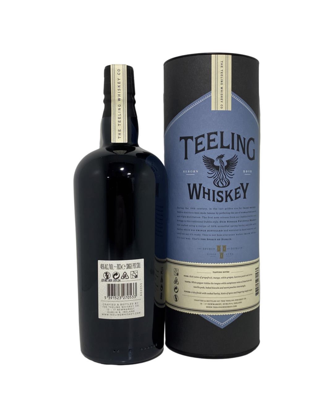 Teeling Single Pot Still, Dublin's spirit re-born. Crafted using a recipe of 50% unmalted and 50% malted barley matured in a combination of virgin oak, ex-wine and ex-bourbon barrels. An abundance of orchard fruit flavours with a hint of peppery spice!