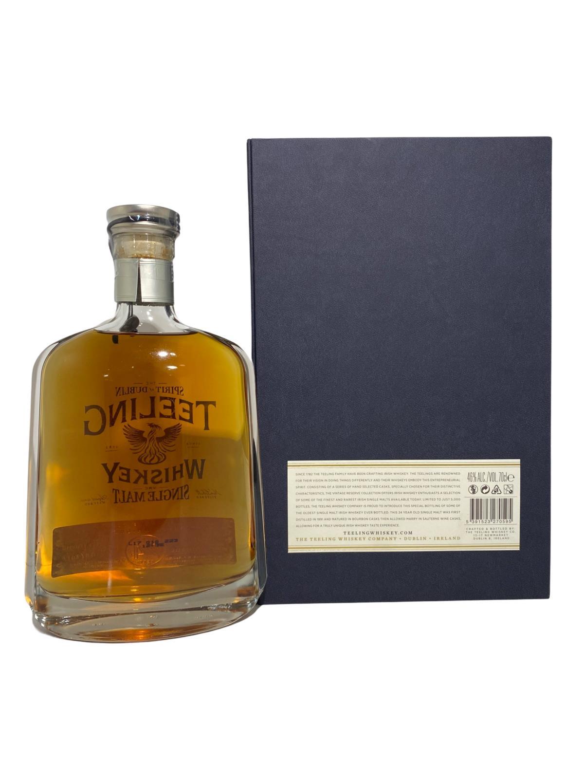 The Teeling 24 Year Old Single Malt Irish Whiskey was first distilled in 1991 and matured in Bourbon casks then allowed marry in Sauternes wine casks producing a wholly unique taste experience. The unique dual maturation imparts an extra depth of fruit flavours that perfectly complement the hint of smoke derived from the inclusion of a small portion of Peated malt as part of the original ingredients used in production. This small batch bottling, limited to just 5,000 70cl bottles, were hand bottled in unique decanter bottles and come with their own certificate of authenticity.