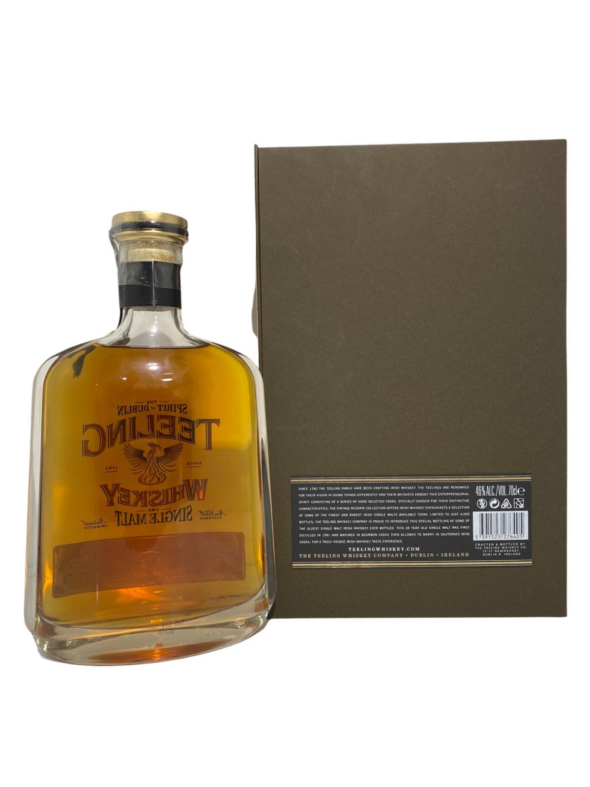 Building on the international success of the Teeling 21 and Teeling 24 Year Old single malts, Teeling now present their latest release; Teeling 28 Year Old Single Malt. This whiskey consists of the same liquid as the World's Best Single Malt winning 24 Year Old single malt, aged for a further four years. This is a very limited release of vintage single malt whiskey, celebrating the very best that Teeling has to offer. Initially aged in ex- Bourbon casks and finished in Sauternes, this special whiskey is limited to just 4,000 bottles.
