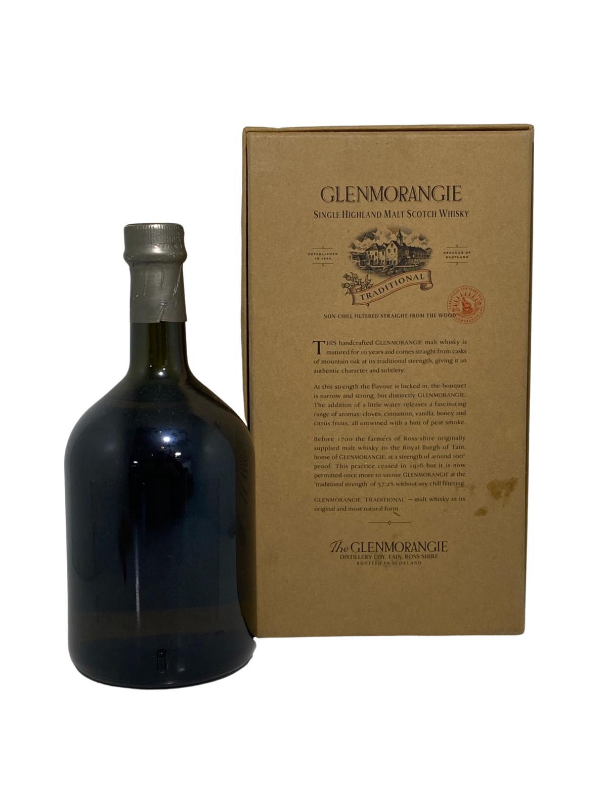 A collectible bottle of Glenmorangie Traditional 100° Proof, from back when Glenmorangie didn't have the tall, slender bottles we know today.