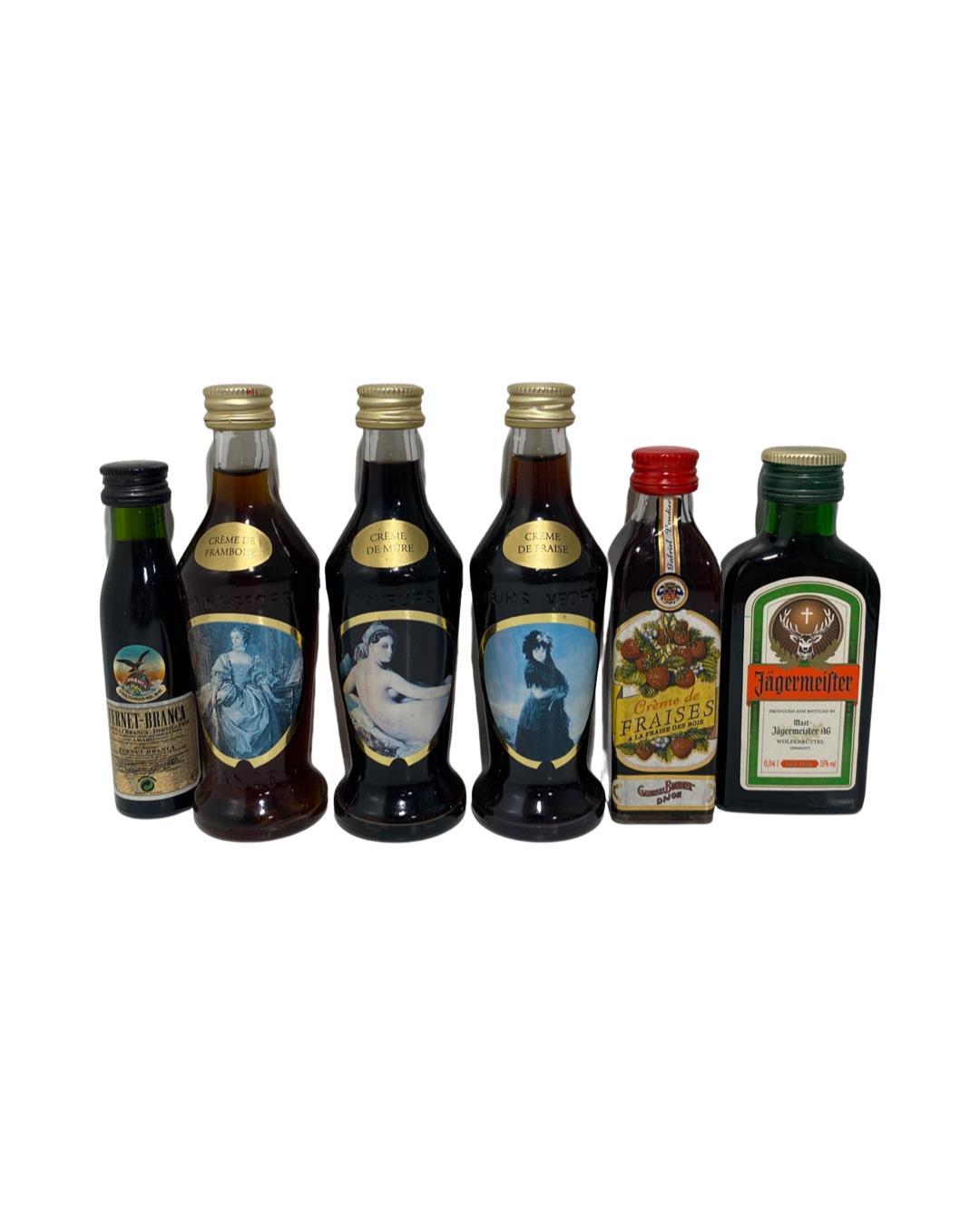423 : 7 Mini Liquers Fernet Branca, Crème de Framboise,De Mure,De fraise, Jagermeister