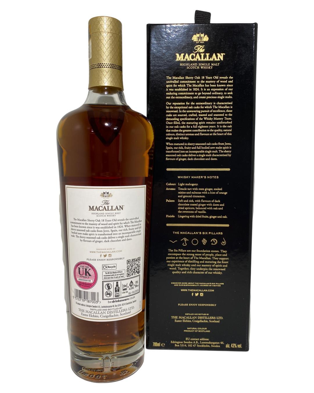 This Macallan 18 Year Old Sherry Oak is a part of the Sherry Oak collection which focuses exclusively on Single Malts aged in rich sherry casks. These hand-selected seasoned oak casks are chosen from the Jerez region for the complexity and warmth that they add to the liquid. This is a full-bodied single malt, spicy and warm on the nose with citrus and ginger on the finish. Not to be missed!