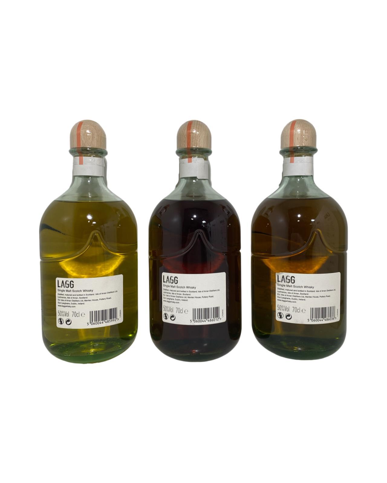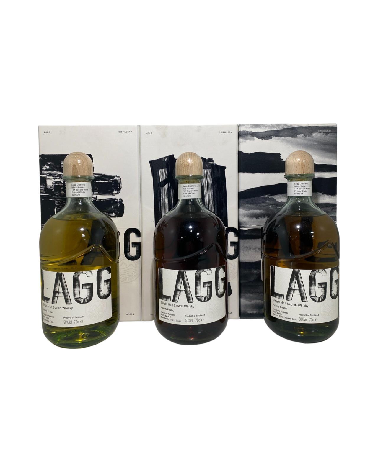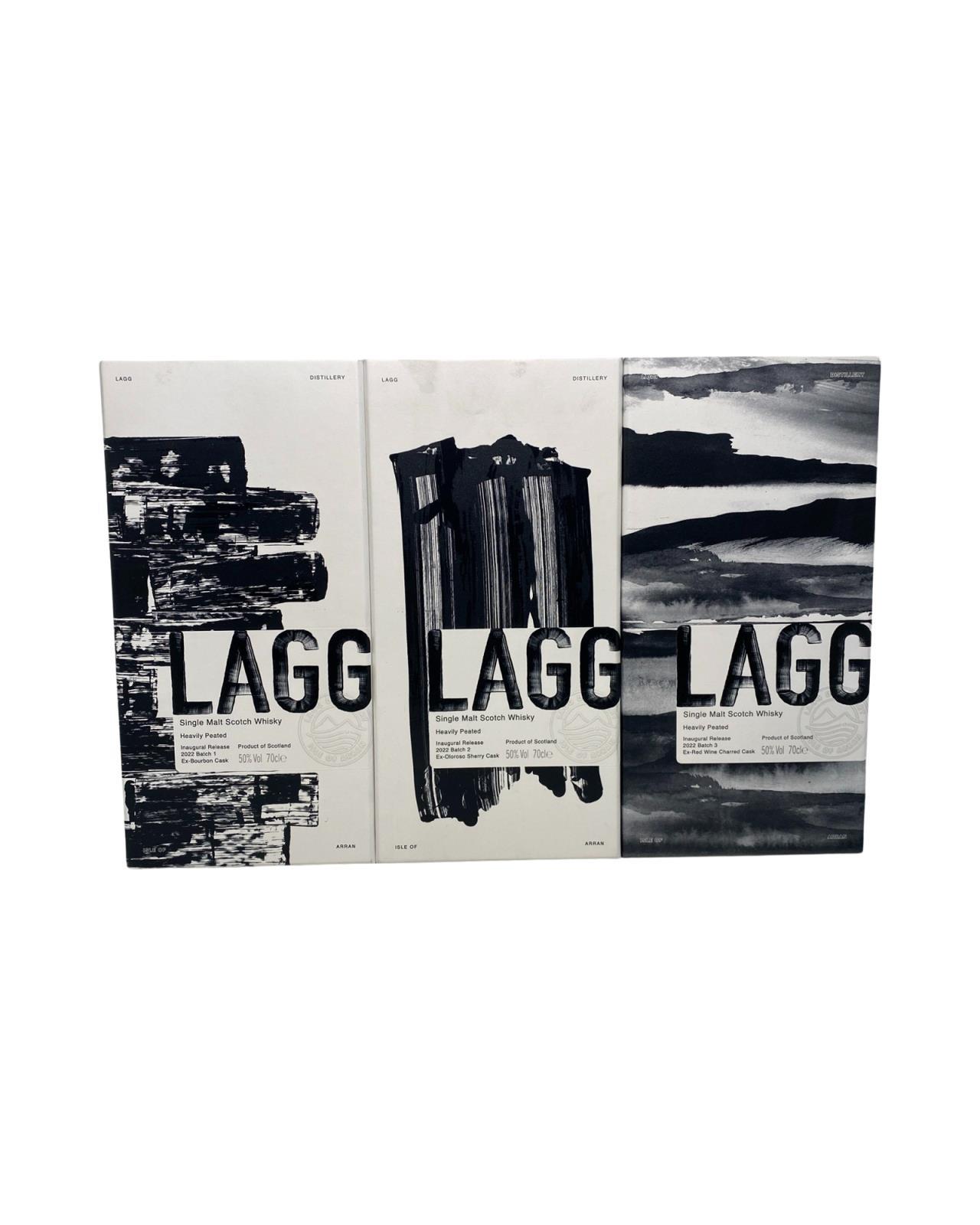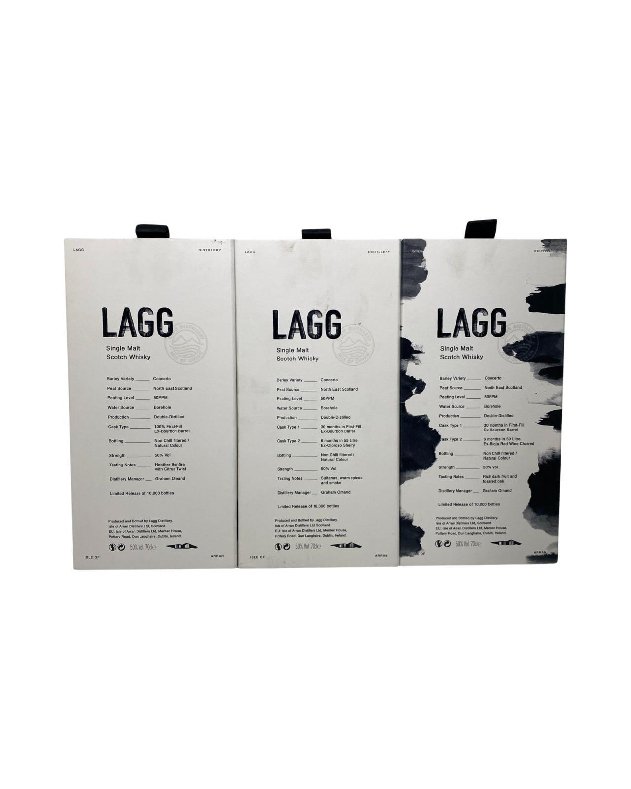 Grab all three editions of Lagg Malt Special Release. This set includes batch 1, batch 2, and batch 3 of Lagg's inaugural single malts. All three are bottled at 50%, but their maturation has been varied: one is ex-bourbon cask; one is ex-red wine charred cask; the last is ex-oloroso sherry cask. Distillery Manager Graham Omand and his team have poured into making these Lagg Single Malt the robust, complex and earthy 'west-coast' style we know you'll love. Batch 1 Batch 1 is 100% matured in Bourbon Barrels for 36 months and was produced using Concerto barley and water from our borehole. Using peat from North East Scotland and the peating level is 50PPM. It is non-chill filtered with no additional colouring and is bottled at 50% abv. This Batch is a limited release of 10,000 bottles worldwide. Batch 2 Batch 2 is matured in Bourbon Barrels for 30 months and finished in 55 litre Ex-Oloroso Sherry Casks for 6 months. It was produced using Concerto barley and water from our borehole. Using peat from North East Scotland and the peating level is 50PPM. It is non-chill filtered with no additional colouring and is bottled at 50% abv. This Batch is a limited release of 10,000 bottles worldwide. Batch 3 Batch 3 is matured in Bourbon Barrels for 30 months and transferred into 50 litre Ex-Rioja Red Wine charred casks for 6 months. It was produced using Concerto barley and water from our borehole. We used peat from North East Scotland and the peating level is 50PPM. It is non chill filtered with no additional colouring and is bottled at 50% abv. This Batch is a limited release of 10,000 bottles worldwide.