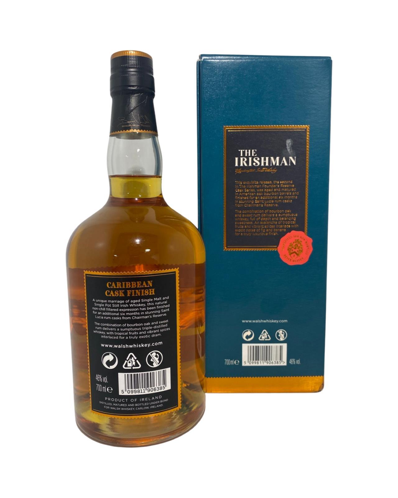 An exclusive, limited release from Walsh Whiskey Distillery, home to the Irishman and the Writers' Tears range. The Irishman Founders Reserve Caribbean Cask Finish is a blend of both Single Pot Still and Single Malt whiskeys which were initially aged in ex-Bourbon American oak barrels before being finished in Chairman's Reserve Rum for six months. Summer in a glass with an abundance of tropical fruit flavours!