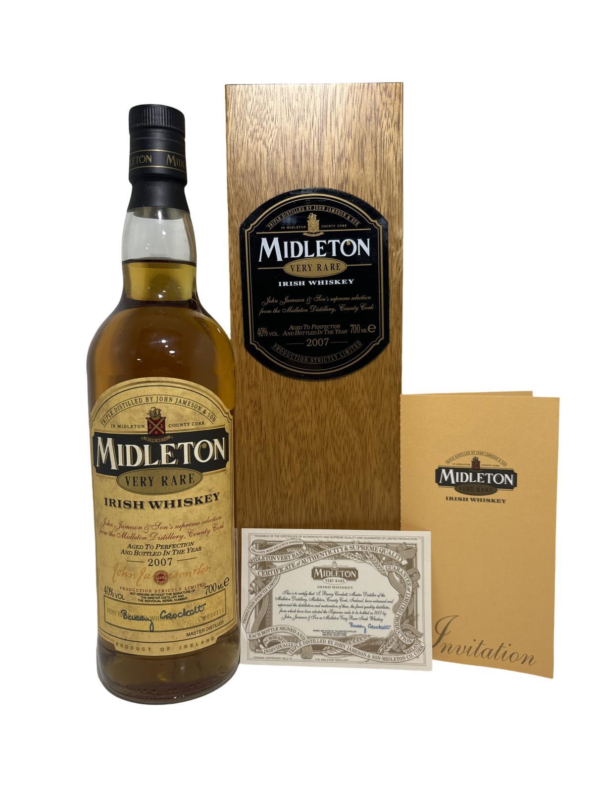The Midleton Very Rare 2007, is a bottling brought out by the Midleton Distillery in Co. Cork. The ‘Midleton Very Rare’ range was launched in 1984 and a new vintage has been released every year since then. Barry Crockett started off the ‘Midleton Very Rare’ range while he was the Master Distiller of Midleton Distillery.The Midleton Very Rare range of whiskeys is a collection of highly regarded Irish whiskeys crafted at the Midleton Distillery in County Cork, Ireland. With a reputation for excellence, these whiskeys are known for their exceptional quality, craftsmanship, and limited availability. Characterized by smoothness, complexity, and depth of flavour, Midleton Very Rare often exhibits notes of ripe fruits, honey, vanilla, spices, and oak. The component casks are typically aged for around 12-27 years but each yearly batch is unique and for this reason the whiskeys are highly collectible. To this day the Midleton Very Rare series is still regarded as the pinnacle and benchmark for ultra-premium blended Irish whiskeys.