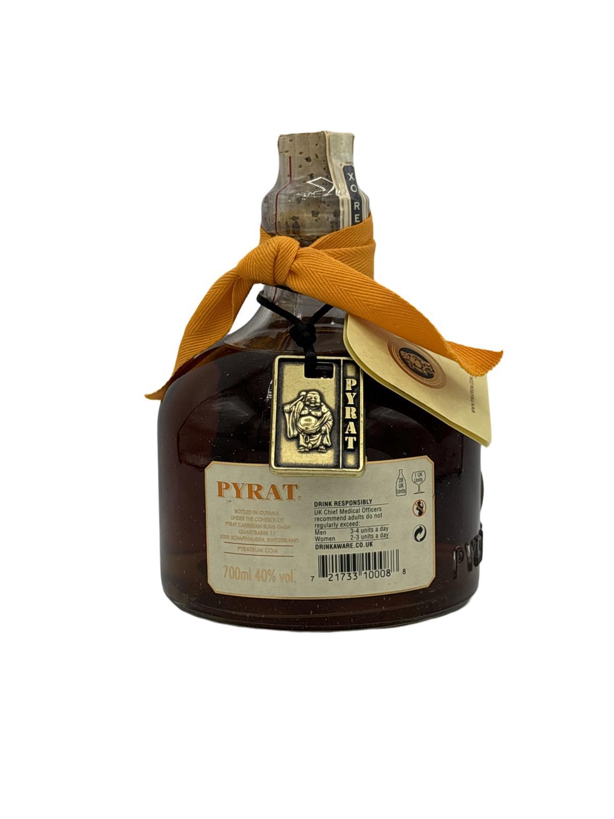 Pyrat Rum XO Reserve is a complex yet mellow blend of select Caribbean rums, aged up to 15 years in French Limousin and American sweet oak barrels. The initial aromas of bright citrus, spices and honey lead to flavors of oak and molasses, orange and cinnamon. The finish is sweet with orange tones persisting into a medium long warm fade. This rum's handcrafted decanter is fashioned after relic rum bottles, adorned with a gold ribbon, a unique number and special ingot tied to the bottle.