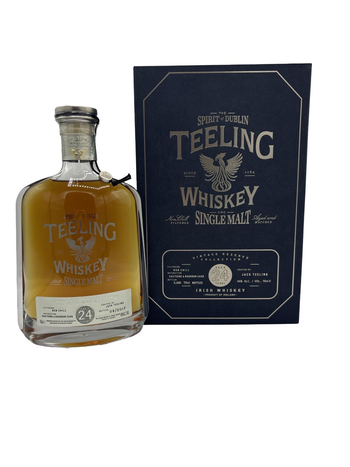 The Teeling 24 Year Old Single Malt Irish Whiskey was first distilled in 1991 and matured in Bourbon casks then allowed marry in Sauternes wine casks producing a wholly unique taste experience. The unique dual maturation imparts an extra depth of fruit flavours that perfectly complement the hint of smoke derived from the inclusion of a small portion of Peated malt as part of the original ingredients used in production. This small batch bottling, limited to just 5,000 70cl bottles, were hand bottled in unique decanter bottles and come with their own certificate of authenticity.