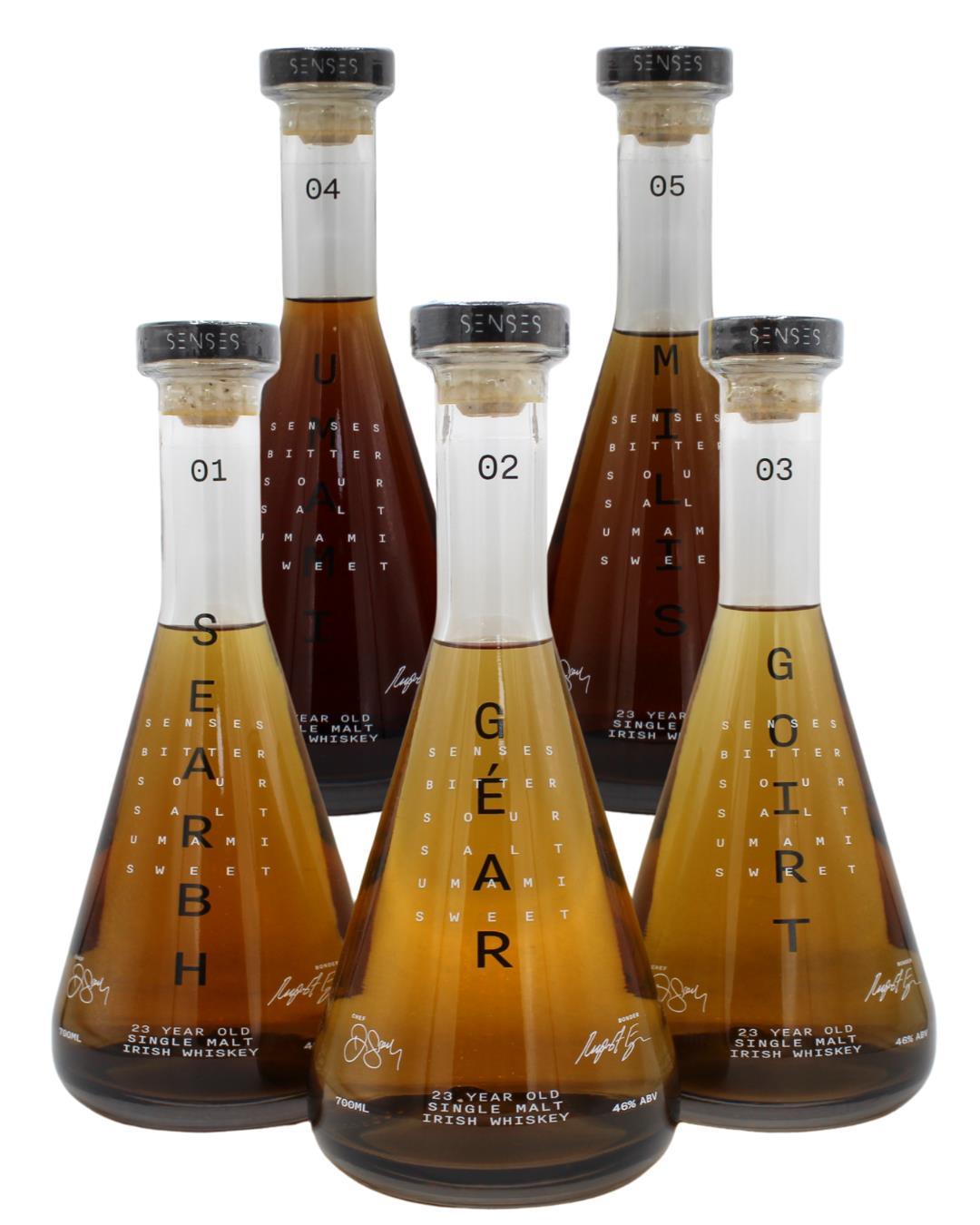 A spirits project unlike any other, born from a shared goal of expressing taste’s five building blocks – Bitter, Sour, Salt, Umami, and Sweet – through a set of five individually crafted and finished ultra-premium 23 year old Single Malt Irish whiskeys, with just 200 sets available globally. The Senses case holds five 700ml bespoke bottles of 23 year old Single Malt Irish whiskeys, a Sample Box featuring five 40ml tasting phials, and a series of beautifully produced cards chronicling the three-year whiskey development journey.