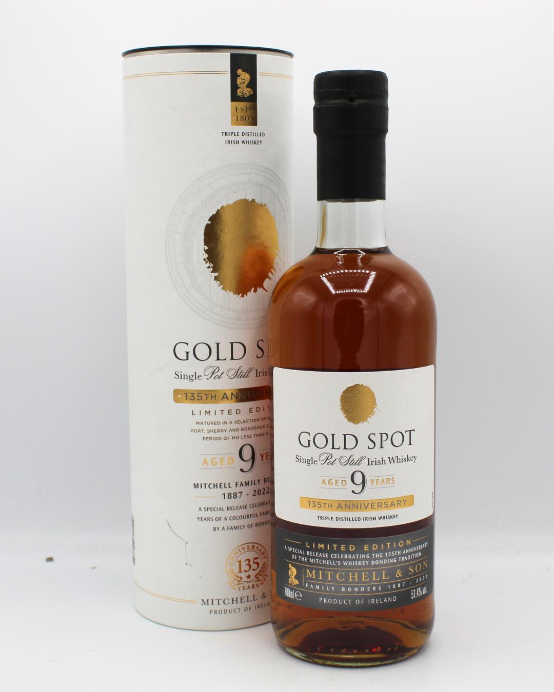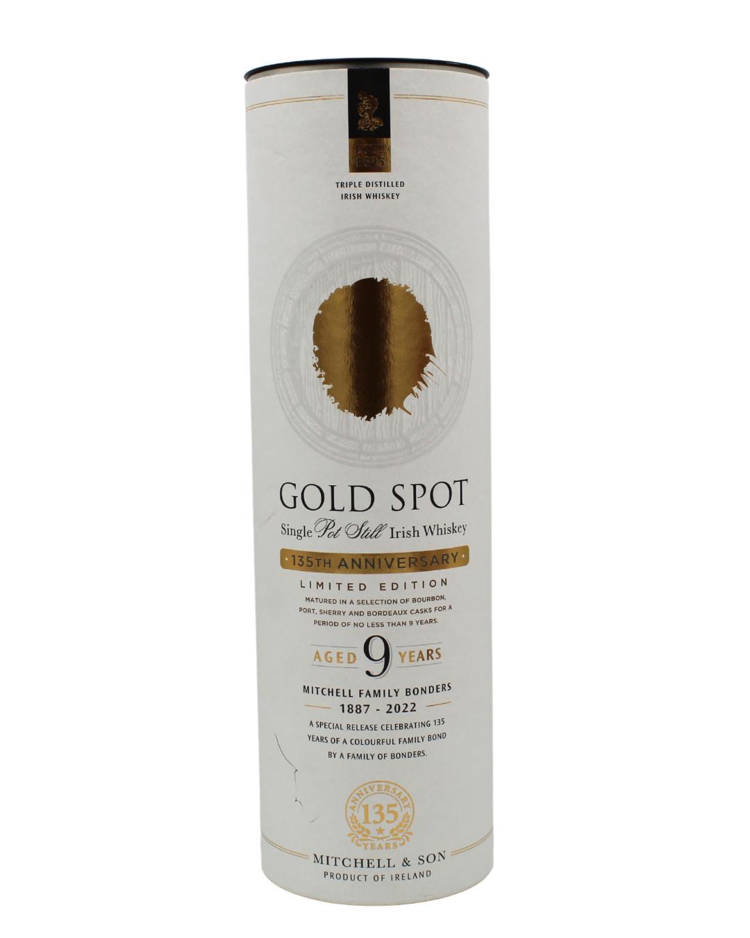 Gold Spot 9 Year Old has aged for at least 9 years in Bourbon Barrels, Sherry Butts, Bordeaux Wine Casks and Port Pipes. A smooth mouthfeel with a subtle mix of fruit, a hint of clove and cracked black peppercorns with a long, spicy finish.