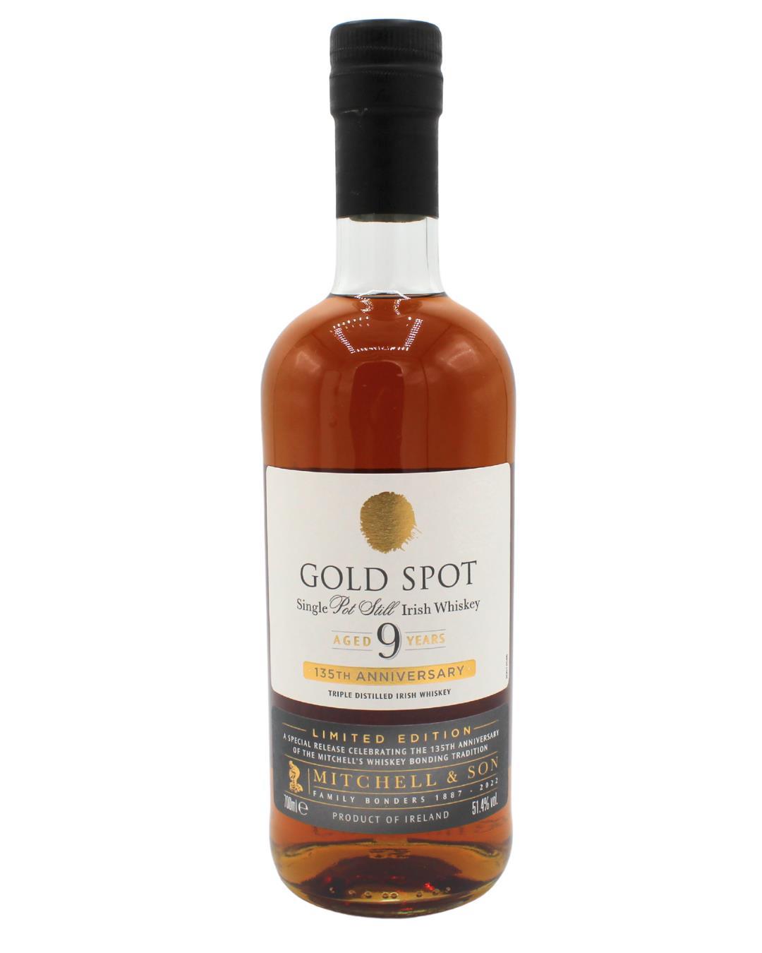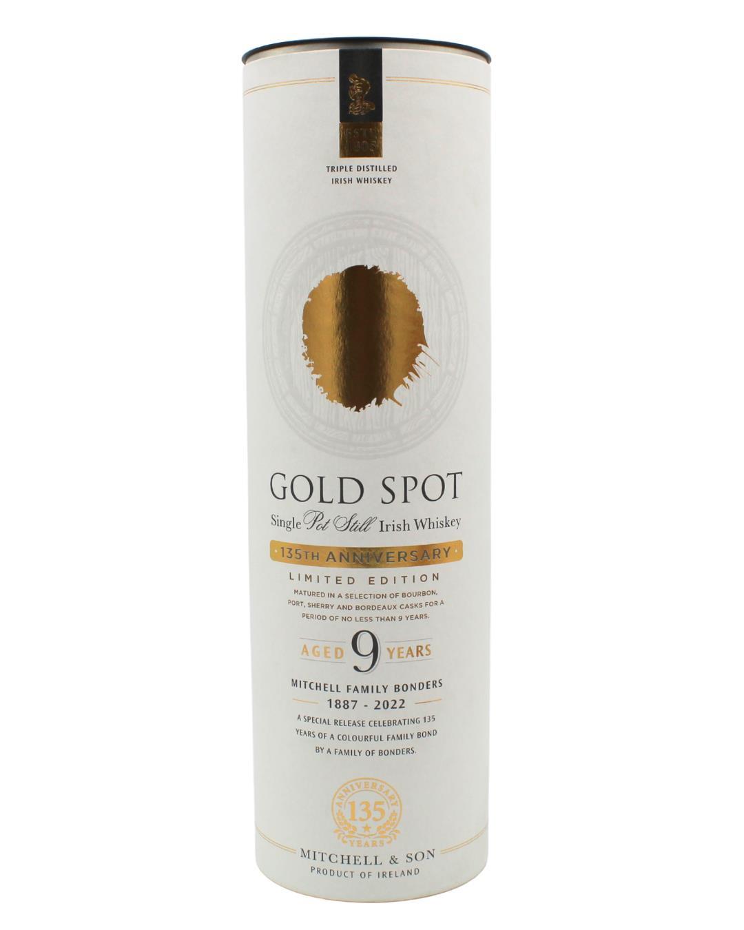 Gold Spot 9 Year Old has aged for at least 9 years in Bourbon Barrels, Sherry Butts, Bordeaux Wine Casks and Port Pipes. A smooth mouthfeel with a subtle mix of fruit, a hint of clove and cracked black peppercorns with a long, spicy finish.
